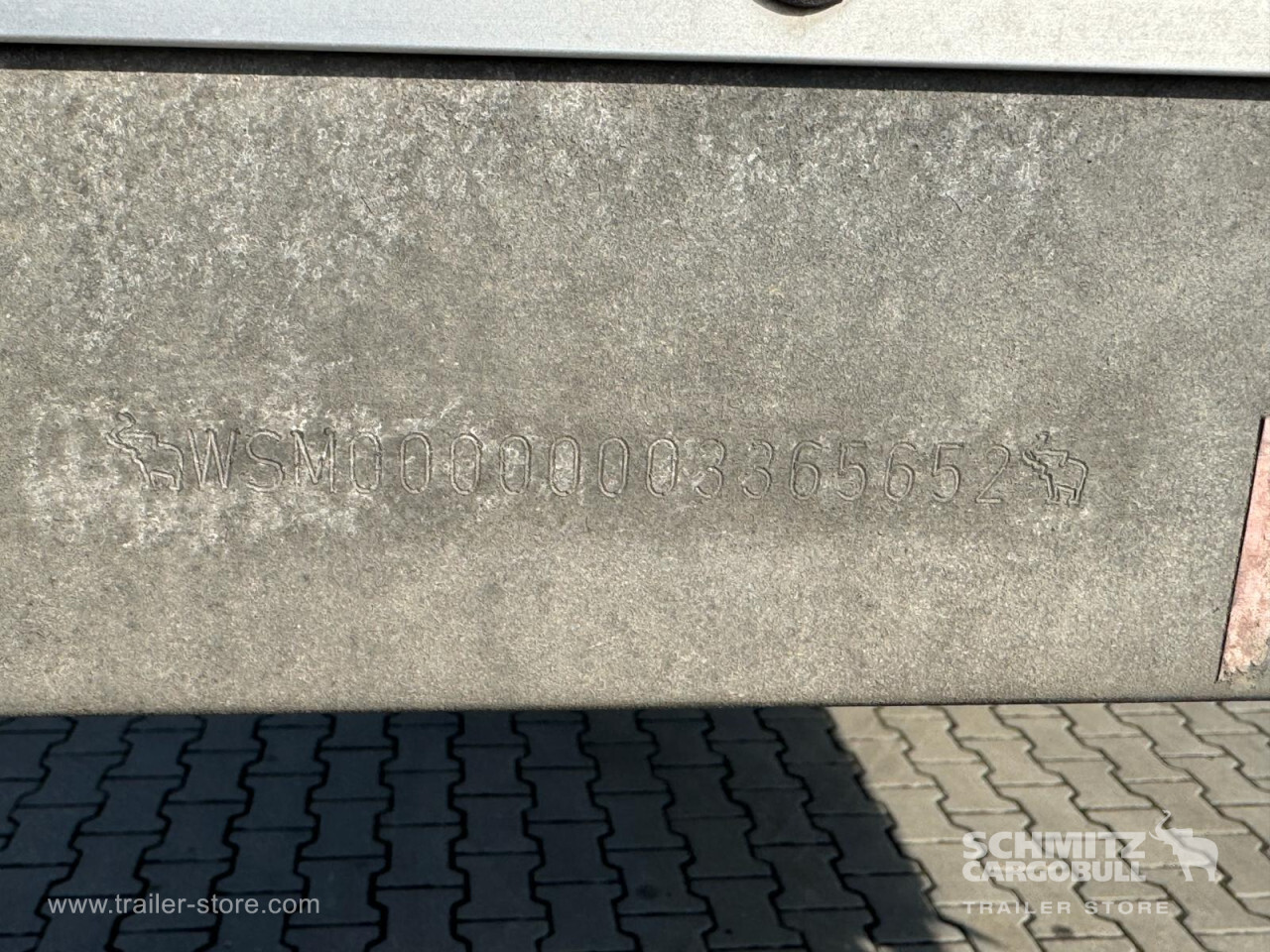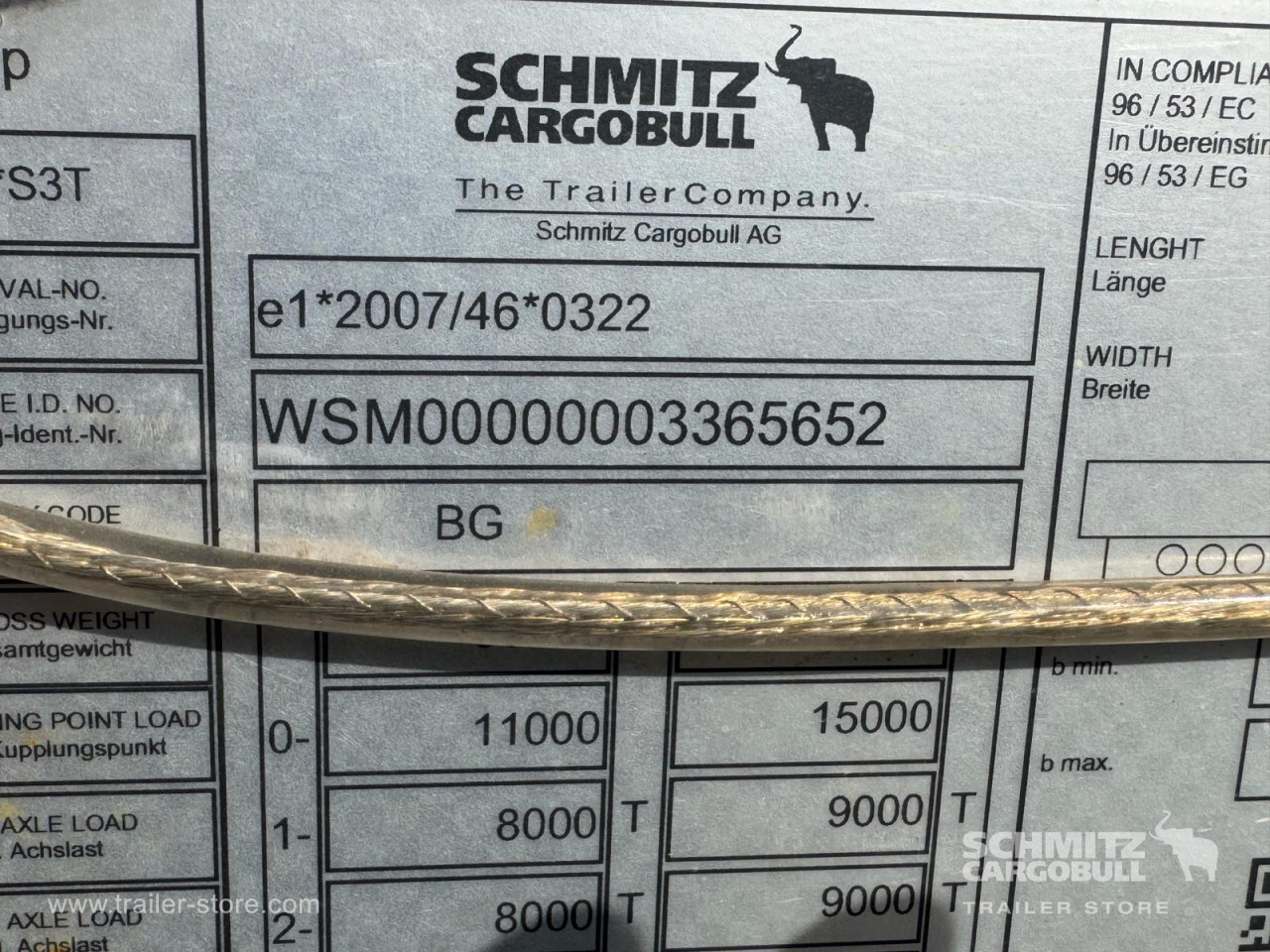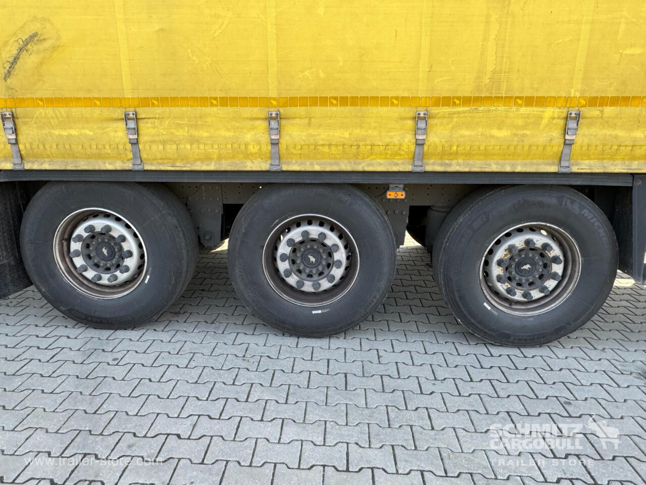 **Safety**\\Rear underrun, Antilock Braking System ABS\\\\**Exterior**\\Air suspension, 1x15 and 2x7 pin plug, Antispray\\\\**Cargo securing**\\DIN EN 12642 (code XL) certificate\\\\**Brake system**\\Disc brake, Schmitz Cargobull\\\\**Floor**\\Wisadeck floor\\\\**Loading area**\\Length 13.620 mm, Width 2.480 mm, Height 2.780 mm, Volume 93 m³\\\\**Tyre sizes**\\1. Achse: 385/65 R22.5 , Tread depth: 13 mm / 13 mm, 2. Achse: 385/65 R22.5 , Tread depth: 13 mm / 13 mm, 3. Achse: 385/65 R22.5 , Tread depth: 13 mm / 13 mm\\\\**Other dimensions and weights**\\Wheel base: 7.700 mm\\\\----