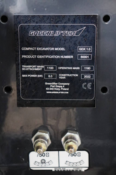 Brand: GreenLifter Type: GDX 1.0 Serial number: 60001 Year of construction: 2022 Fuel: Electric Engine power: 8.0 kW Quick change: Yes Reading operating hours: 5 h Running gear: Tracks Machine weight: 1180 kg Color: white
