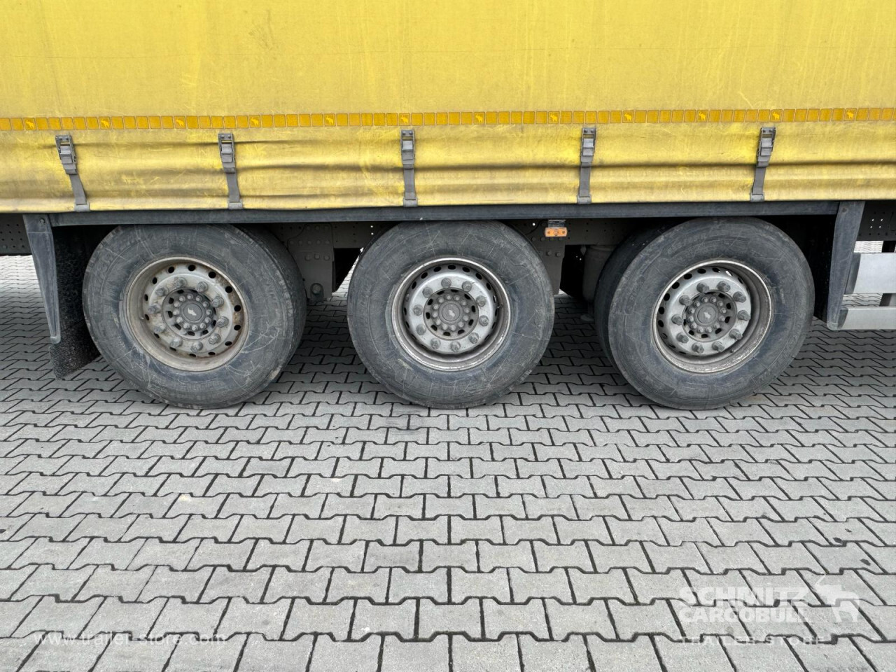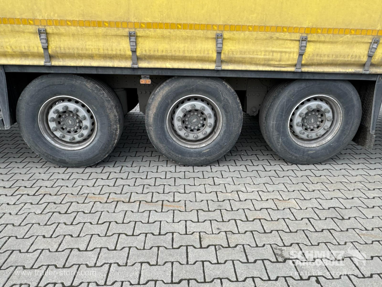**Safety**\\Rear underrun, Antilock Braking System ABS\\\\**Exterior**\\Air suspension, 1x15 and 2x7 pin plug, Antispray\\\\**Cargo securing**\\DIN EN 12642 (code XL) certificate\\\\**Brake system**\\Disc brake, Schmitz Cargobull\\\\**Floor**\\Wisadeck floor\\\\**Loading area**\\Length 13.620 mm, Width 2.480 mm, Height 2.780 mm, Volume 93 m³\\\\**Tyre sizes**\\1. Achse: 385/65 R22.5 , Tread depth: 11 mm / 11 mm, 2. Achse: 385/65 R22.5 , Tread depth: 11 mm / 11 mm, 3. Achse: 385/65 R22.5 , Tread depth: 11 mm / 11 mm\\\\**Other dimensions and weights**\\Wheel base: 7.700 mm\\\\----