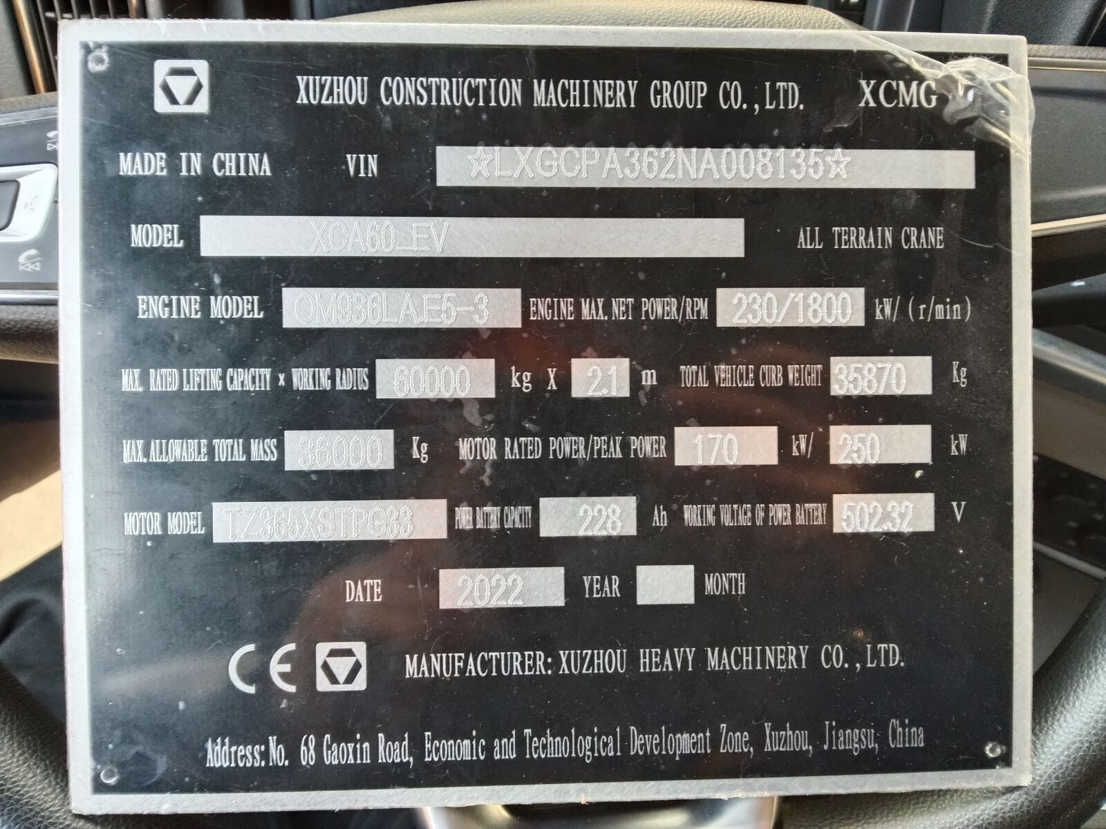 The XCA60_EV All Terrain Crane is a "Internet +" smart crane, in which mobile Internet, mobile terminal remote control function are integrated. The tires on left and right side move up/down separately to adapt to the road conditions, to effectively enhance the stability of steering operation at high speed and achieve excellent off-road performance when driving on the narrow road or the road with poor road conditions.