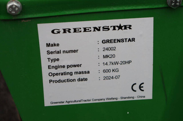 Brand: Greenstar Type: MK20 Serial number: 24002 Year of construction: 2024 Fuel: Diesel Engine power: 20 hp Reading operating hours: 1 h Machine weight: 600 kg Color: green