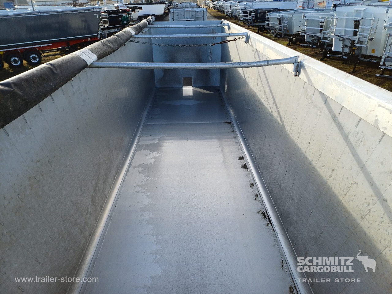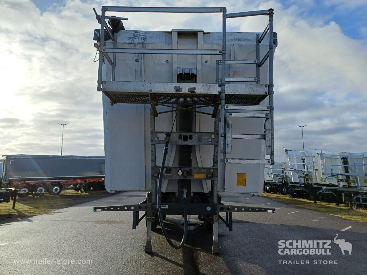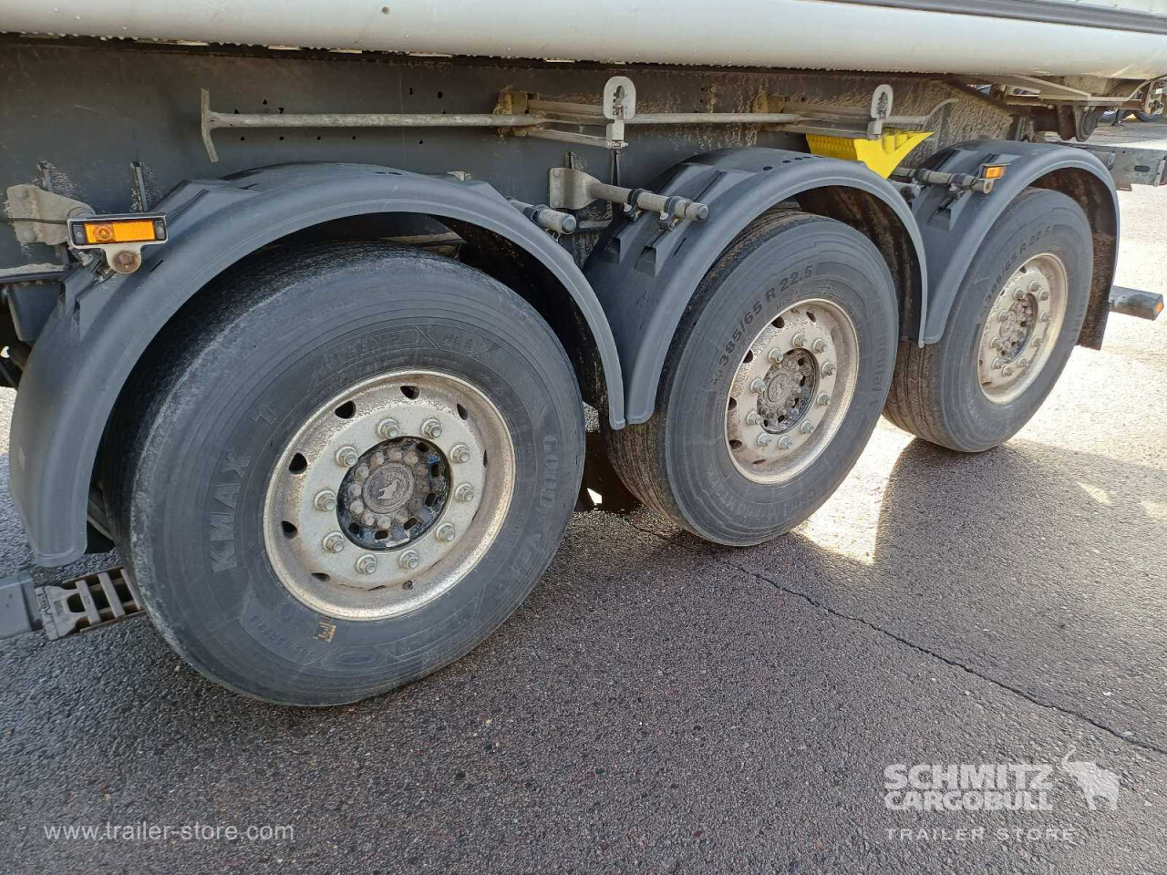 Remarks: **Safety**\\Hinged rear underrun, Antilock Braking System ABS, Brake wear indicator\\\\**Exterior**\\Air suspension, Lift axle front, Exterior pendulum tailgate, Grain chute, Roof rolling tarpaulin, Access platform, 1x15 and 2x7 pin plug, Antispray, Light alloy rims\\\\**Brake system**\\Disc brake, Schmitz ROTOS\\\\**Loading area**\\Length 9.807 mm, Width 2.440 mm, Height 2.200 mm, Volume 52 m³\\\\**Tyre sizes**\\1. Achse: 385/65 R22.5 , Tread depth: 9 mm / 10 mm, 2. Achse: 385/65 R22.5 , Tread depth: 10 mm / 10 mm, 3. Achse: 385/65 R22.5 , Tread depth: 5 mm / 5 mm\\\\**Other dimensions and weights**\\GVW: 36.000 kg\\\\----