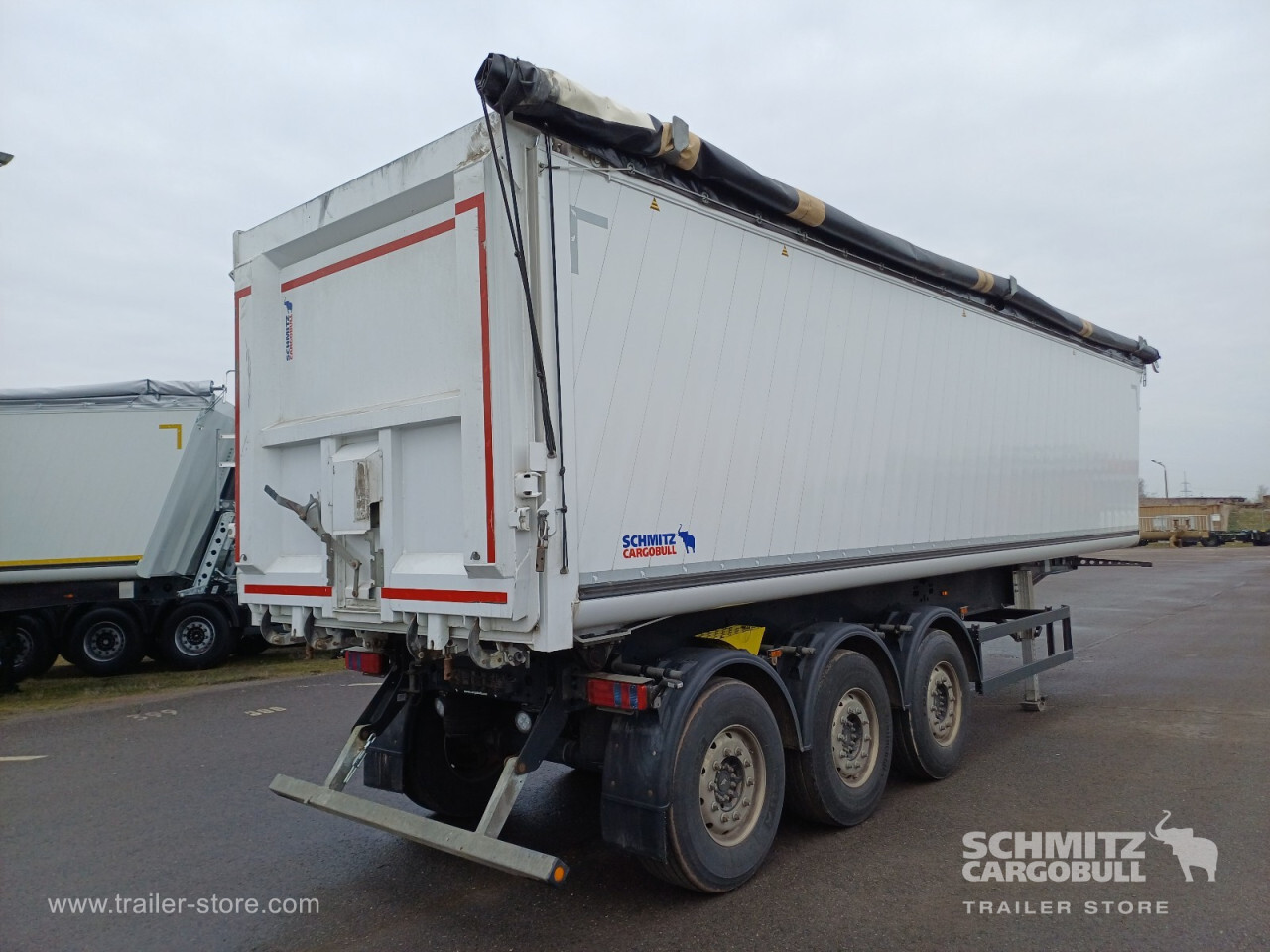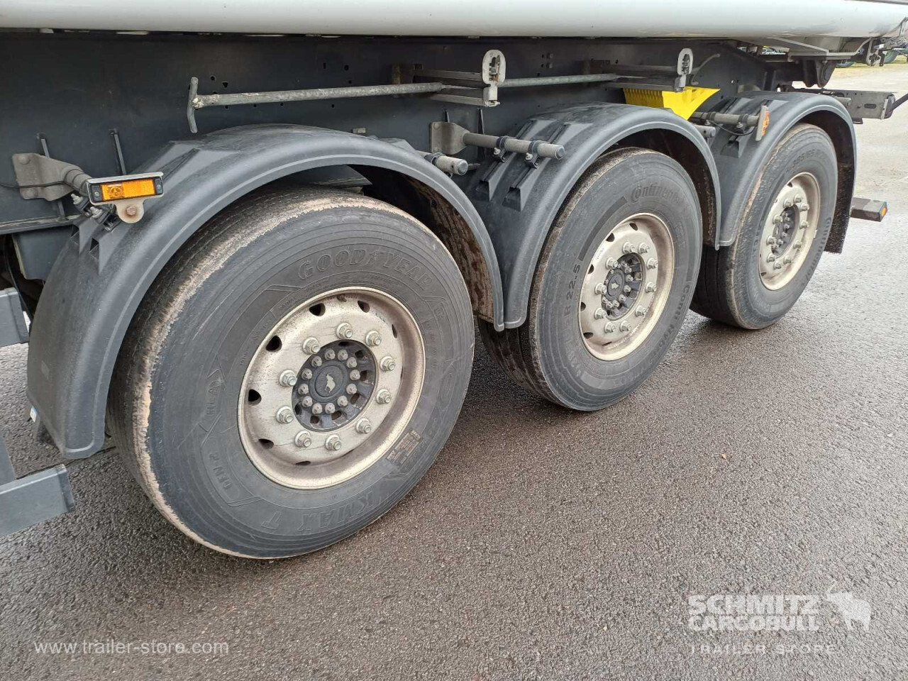 Remarks: **Safety**\\Hinged rear underrun, Antilock Braking System ABS, Brake wear indicator\\\\**Exterior**\\Air suspension, Lift axle front, Exterior pendulum tailgate, Grain chute, Roof rolling tarpaulin, Access platform, 1x15 and 2x7 pin plug, Antispray, Light alloy rims\\\\**Brake system**\\Disc brake, Schmitz ROTOS\\\\**Loading area**\\Length 9.807 mm, Width 2.440 mm, Height 2.200 mm, Volume 52 m³\\\\**Tyre sizes**\\1. Achse: 385/65 R22.5 , Tread depth: 11 mm / 8 mm, 2. Achse: 385/65 R22.5 , Tread depth: 10 mm / 11 mm, 3. Achse: 385/65 R22.5 , Tread depth: 9 mm / 7 mm\\\\**Other dimensions and weights**\\GVW: 36.000 kg\\\\----