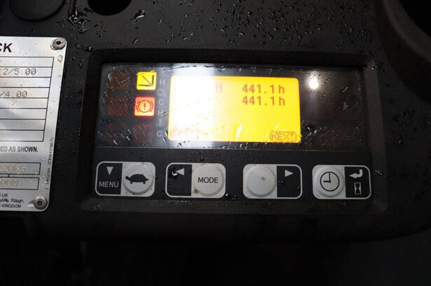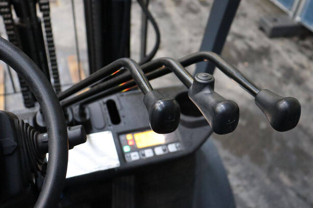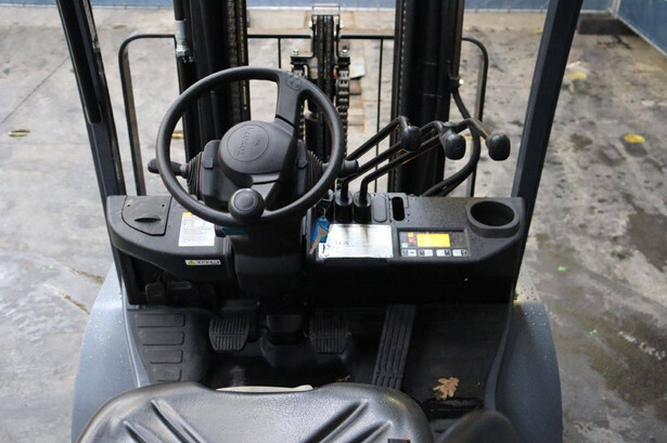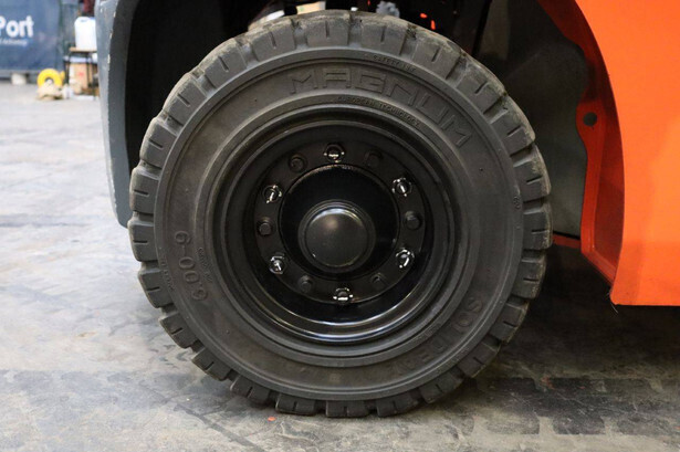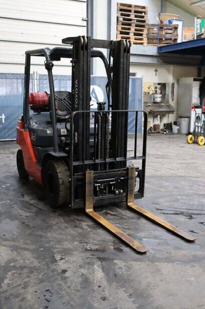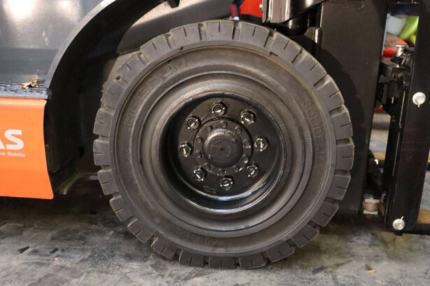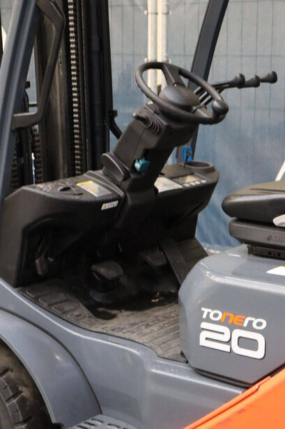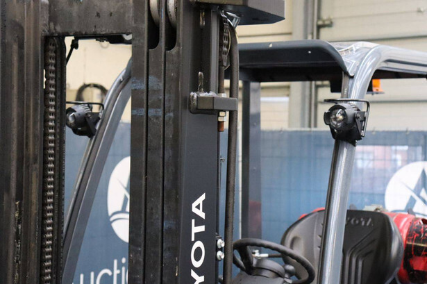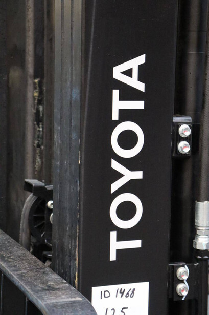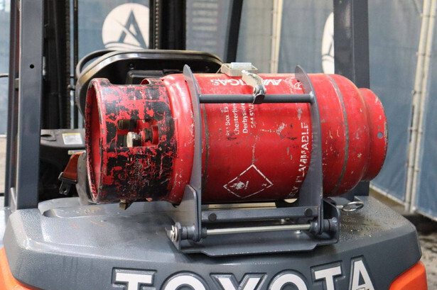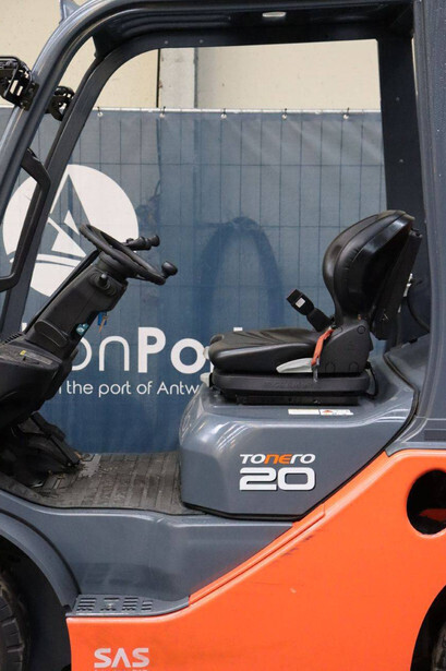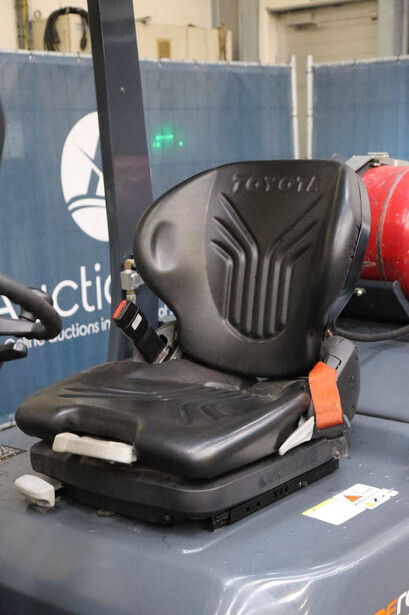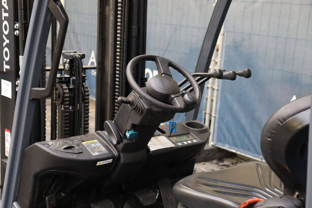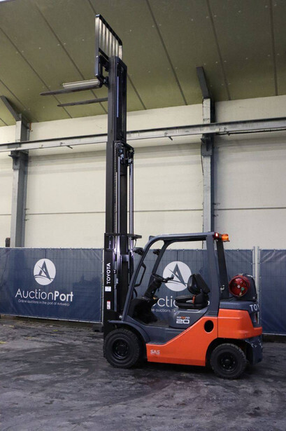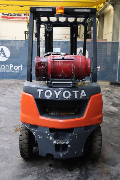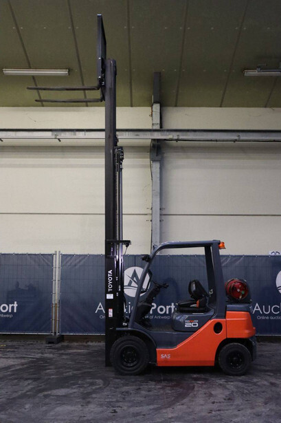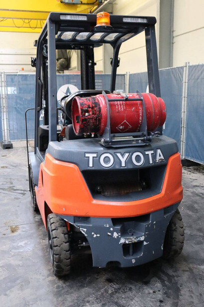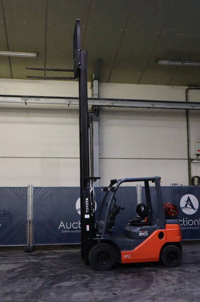 Brand: Toyota Type: 02-8FGF20 Serial number: 8FGF25-86327 Year of construction: 2024 Fuel: LPG Mast type: Triplex Sideshift: Yes Lifting capacity: 2000 kg Lifting height: 4700 mm Operating hours read: 441 h Machine weight: 3570 kg Tires: Solid tires Color: orange