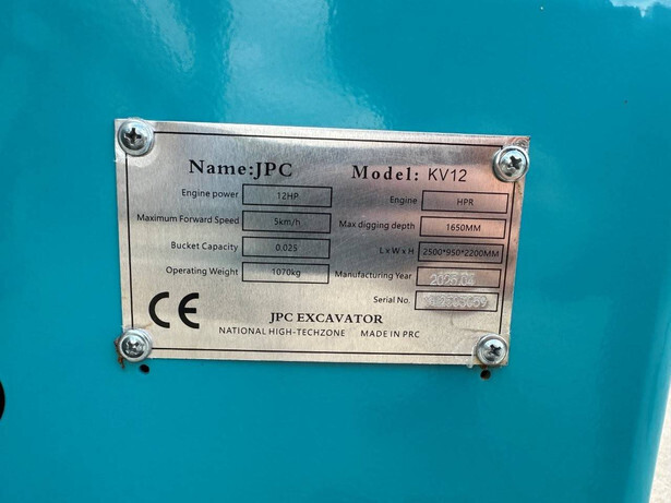 Brand: JPC Type: KV12 Serial number: YM25031059 Year of construction: 2025 Fuel: Diesel Engine power: 12 HP Engine brand: BUY diesel Number of cylinders: 1 Quick change: No Read operating hours: New Running gear: Tracks Track width: 180 mm Machine weight: 1070 kg Color: blue Transport dimensions: 2500x950x2200 mm Tray width: 300 mm