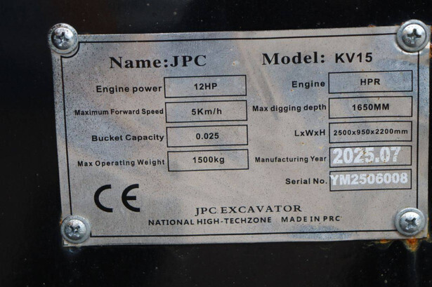 Brand: JPC Type: KV15 Serial number: YM2506008 Year of construction: 2025 Fuel: Diesel Engine power: 12 HP Quick change: No Reading operating hours: 1 h Running gear: Tracks Machine weight: 1500 kg Color: yellow