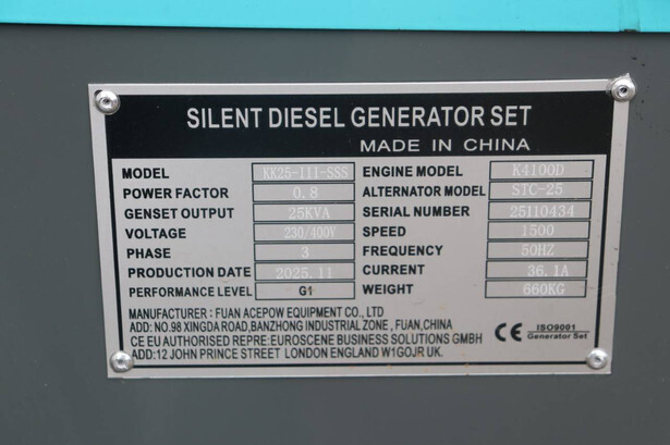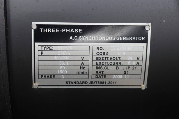 Brand: Kawakenki Type: KK25-III-SSS Serial number: 25110434 Year of construction: 2025 Fuel: Diesel Power: 25 kVA Voltage: 230/400 V Current: 36 A Machine weight: 660 kg Color: blue