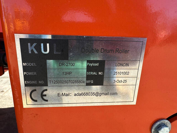 Brand: Kul Type: DR-2700 Serial number: 25101002 Year of construction: 2025 Fuel: Diesel Engine make and type: LONCIN Engine power: 13 HP Number of cylinders: 1 Reading operating hours: 5 p.m. Machine weight: 1100 kg Transport dimensions: 2100 x 1000 x 2150 mm Working width: 900 mm Drum diameter: 550 mm Color: orange