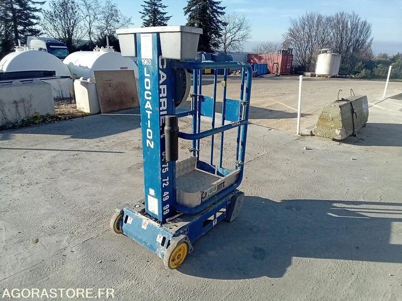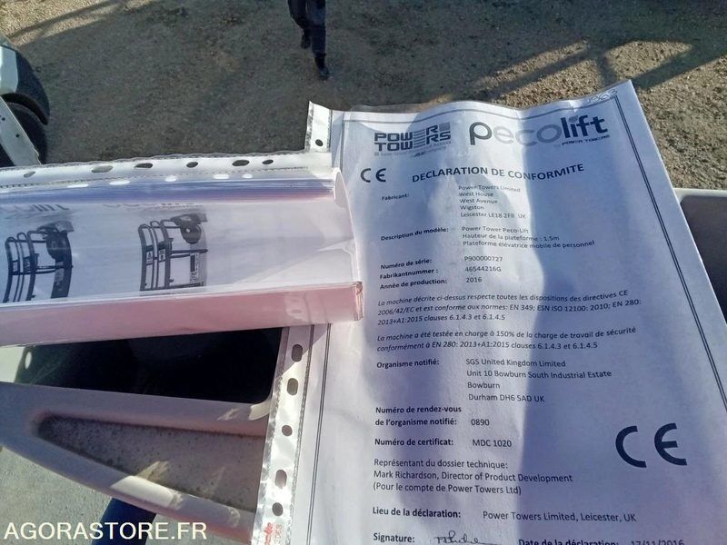 JLG Pecolift Weight: 180 Overall height: 1.55 Overall length: 0.985 Overall width: 0.7 FR: Type de véhicule Nacelle Date de mise en circulation: JLG Charge maximale: 150kg Hauteur de travail max: 3.5m Nacelle manuelle Hauteur de travail maximale: 3,50 m Hauteur de plate-forme: 1,50 m Dimensions du panier : 720 mm x 600 mm Longueur x largeur Surface au sol : 985 mm x 700 mm Charge maximale: 150 kg (1 personne plus outils) DIMENSIONS REPLIÉE Ref No:VT49330