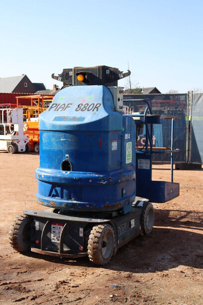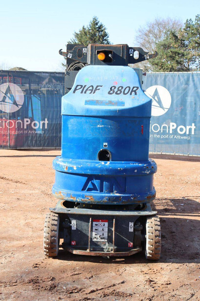 Brand: JLG Type: Piaf 880R Serial number: M08EA047 Fuel: Electric Lifting capacity: 200 kg Working height: 8.8 m Chassis: Wheels Type: Mast lift Tires: Solid tires Color: blue