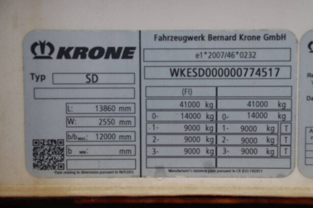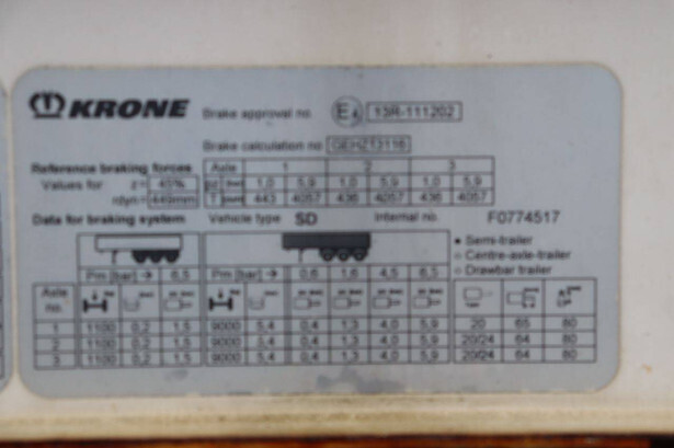 Brand: Krone Type: SD Chassis number: WKESD000000774517 Year of construction: Not known MTM: 41000 kg Number of axles: 3 Brakes: Disc brakes