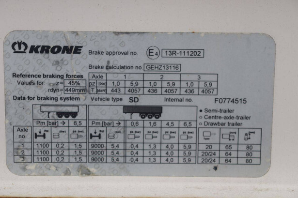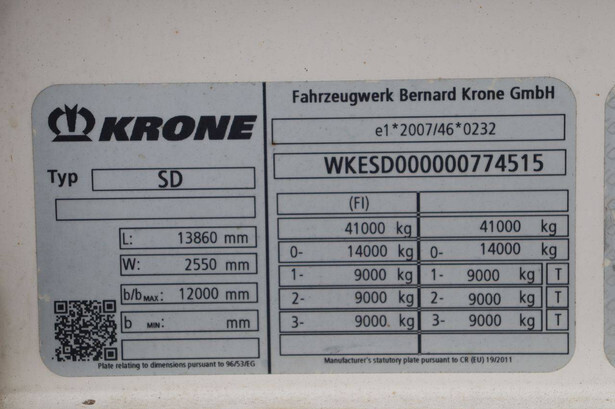 Brand: Krone Type: SD Chassis number: WKESD000000774515 Year of construction: Not known MTM: 41000 kg Number of axles: 3 Brakes: Drum brakes Odometer reading: 287064 KM