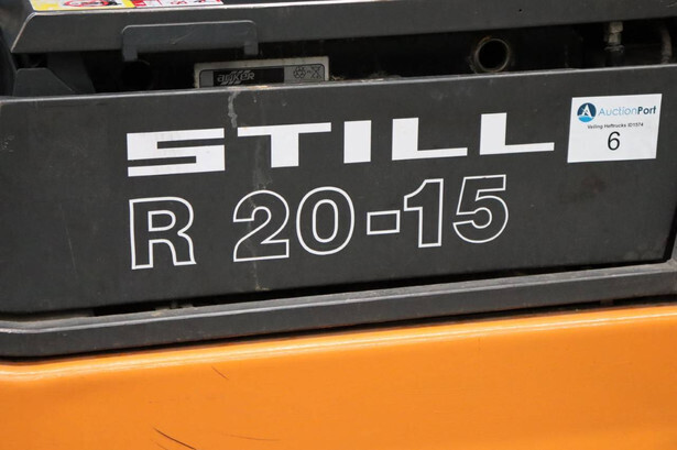 Brand: Still Type: R 20-15 Serial number: S12007007812 Fuel: Electric Mast type: Triplex Sideshift: No Lifting capacity: 1500 kg Lifting height: 4600 mm Operating hours read: 21088 h Tires: Solid tires Color: orange