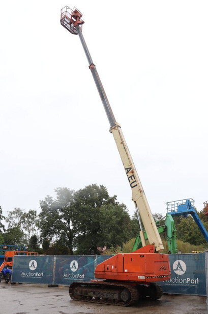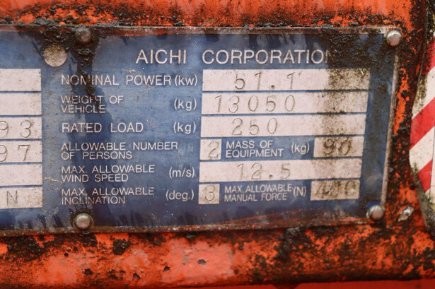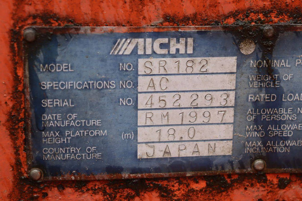 Brand: Aichi Type: SR182 Serial number: 452293 Year of construction: 1997 Fuel: Diesel Lifting capacity: 250 kg Working height: 20 m Reading operating hours: 1009 h Machine weight: 13050 kg Running gear: Tracks Type: Telescopic boom lift Color: orange