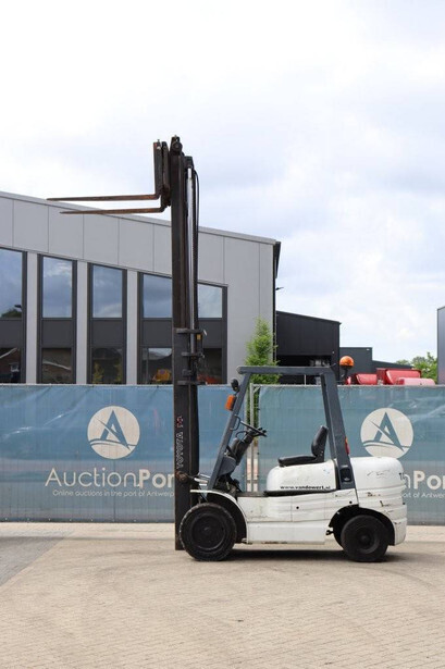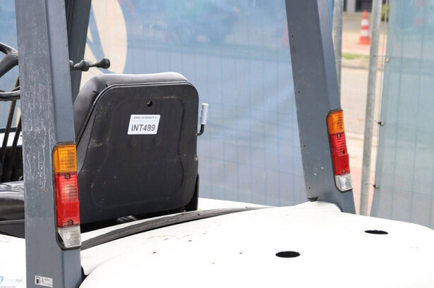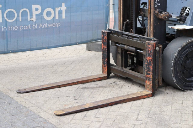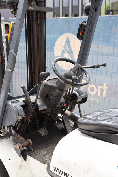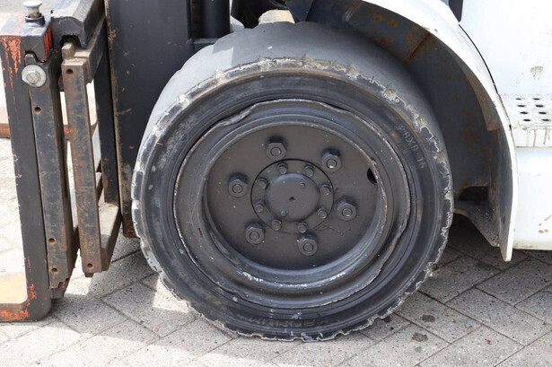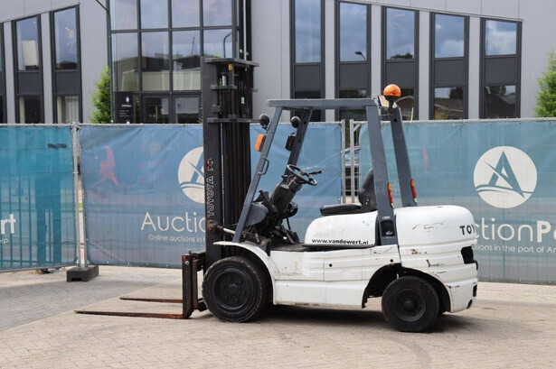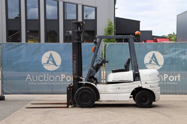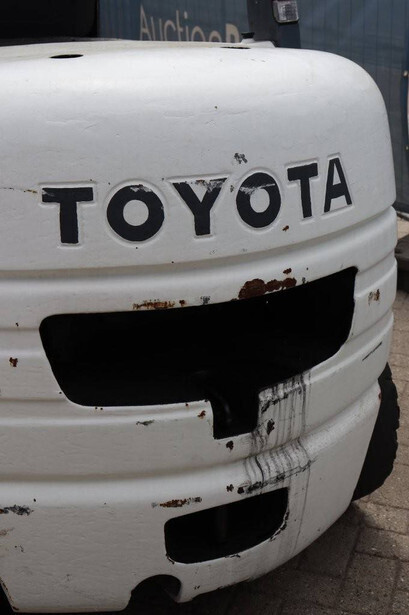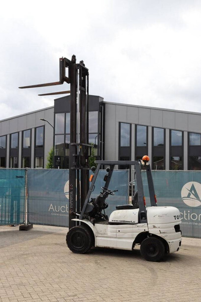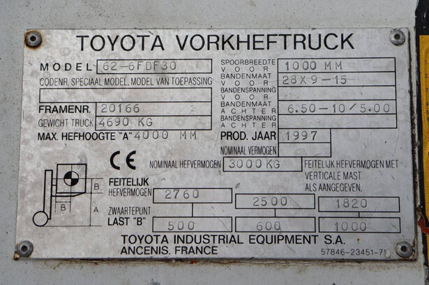 Brand: Toyota Type: 62-6FDF30 Serial number: 20166 Year of construction: 1997 Fuel: Diesel Mast type: Duplex Sideshift: Yes Lifting capacity: 3000 kg Lifting height: 4000 mm Operating hours read: 9610 h Machine weight: 4690 kg Tires: Solid tires Color: white
