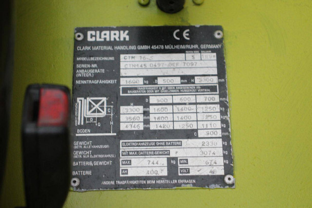 Brand: Clark Type: CTM 16S Serial number: CTN1450497OEF7097 Year of construction: 1998 Fuel: Electric Mast type: Triplex Sideshift: Yes Lifting capacity: 1600 kg Lifting height: 4346 mm Operating hours read: 6855 h Machine weight: 3074 kg Tires: Solid tires Color: green