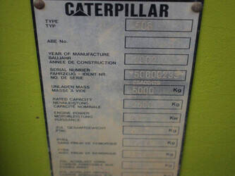 Brand: Caterpillar Type: 506 Serial number: 50600233 Year of construction: 2002 Fuel: Diesel Engine power: 64.0 kW Lifting capacity: 2500 kg Operating hours read: 5742 h Machine weight: 5000 kg Tires: Pneumatic tires Color: green