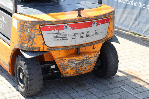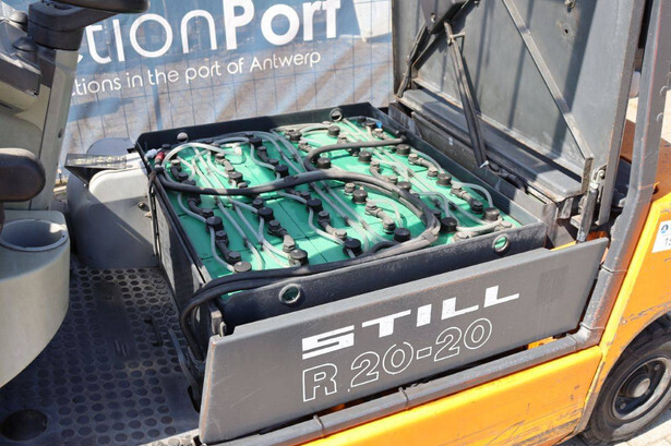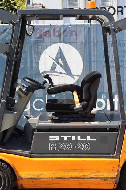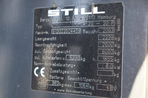 Brand: Still Type: R20-20P Serial number: 512022004459 Year of construction: 2003 Fuel: Electric Mast type: Triplex Sideshift: Yes Lifting capacity: 2000 kg Lifting height: 4790 mm Operating hours read: 17621 h Machine weight: 3302 kg Tires: Solid tires Color: orange