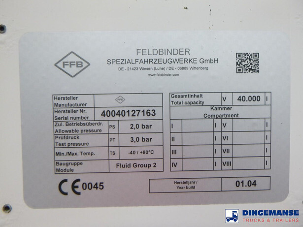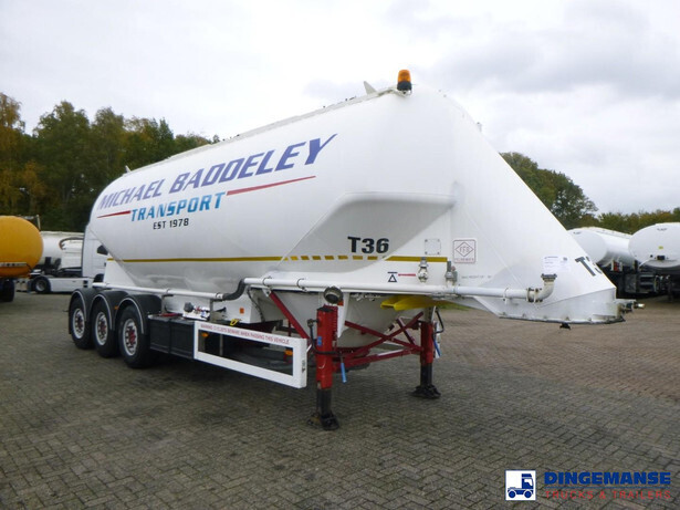 Aluminium powder tank (cement silo), Capacity 40000 liters, 1 Compartment, Year of construction 2004, Test pressure 3.0 bar, Max working pressure 2.0 bar, Air suspension, Steering axle, ABS, Mercedes axles, Disc brakes, Shipment dimensions 1060x250x360 cm