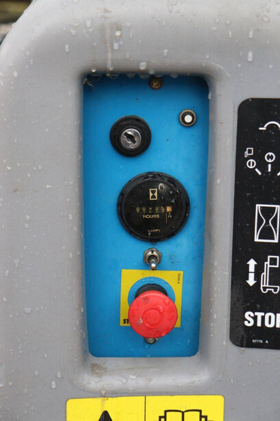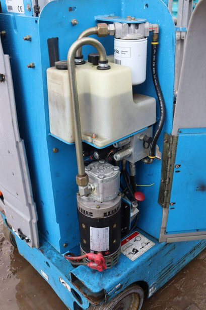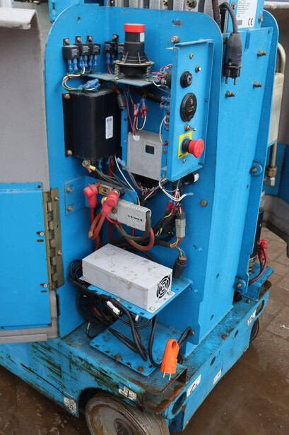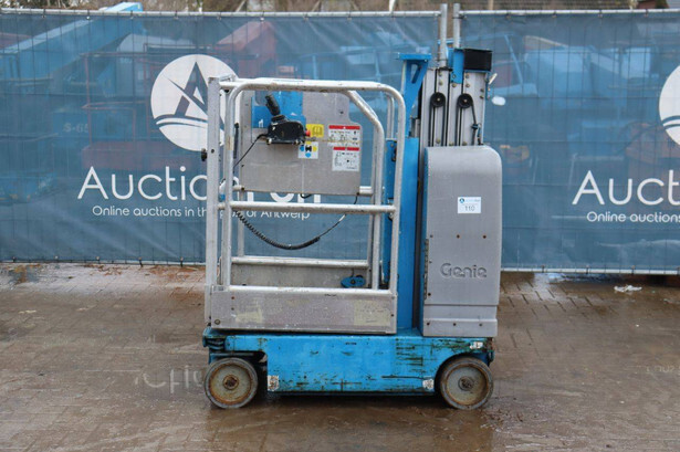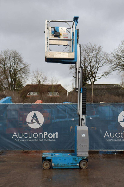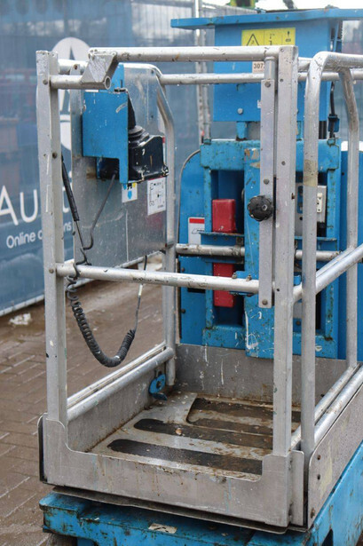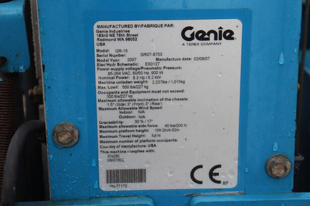 Brand: Genie Type: GR-15 Serial number: GR07-8703 Year of construction: 2007 Fuel: Electric Lifting capacity: 227 kg Working height: 6.47 m Operating hours read: 646 h Machine weight: 1015 kg Chassis: Wheels Type: Mast lift Tires: Non-marking tires Color: blue