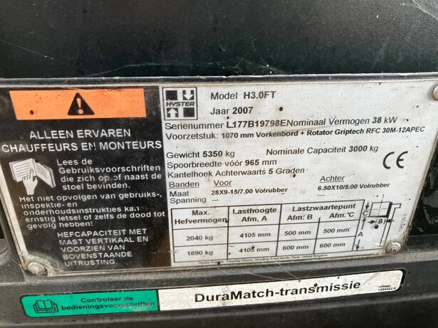 Brand: Hyster Type: H3.0FT Serial number: L177B19798E Year of construction: 2007 Fuel: LPG Mast type: Duplex Sideshift: No Lifting capacity: 2040 kg Lifting height: 4105 mm Operating hours read: 17962 h Machine weight: 5350 kg Tires: Non-marking tires Color: yellow
