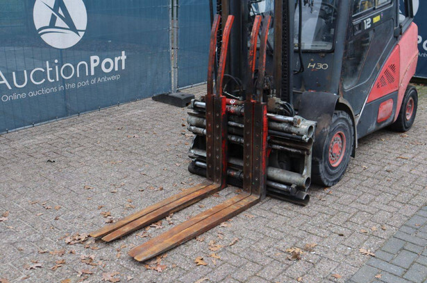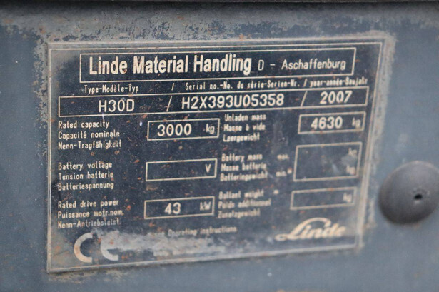 Brand: Linde Type: H30D Serial number: H2X393U05358 Year of construction: 2007 Fuel: Diesel Mast type: Duplex Sideshift: Yes Lifting capacity: 3000 kg Lifting height: 4500 mm Operating hours read: 17931 h Machine weight: 4630 kg Tires: Solid tires Color: red