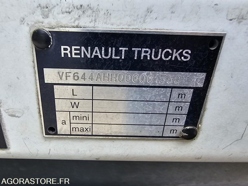 Renault Midlum Fuel: gas Axle number: 2 Axle configuration: 4x2 Axle 1 common tyre size: 275/70R22,5 Gearbox type: automatic FR: Type de véhicule Bom IMPORTANT: VENTE EN L'ETAT - batterie HS à remplacer Etat carrosserie: Moyen Climatisation: Non Etat moteur boite pont: En état de fonc Marque de la benne: Semat Nombre de compartiments: 1 Ad Blue: Oui Caméra arrière Graissage automatique Véhicule roulant Batterie à remplacer Corrosion benne Poi t de Corrosion porteur Sellerie à remettre en état Tapis de sol endommagé Ref No:334005 VIN: VF644AHH000001530