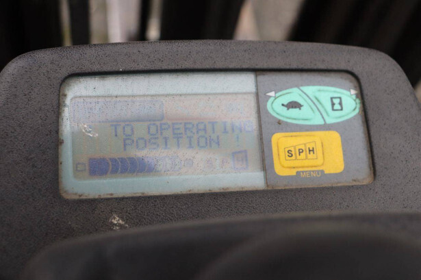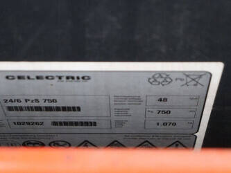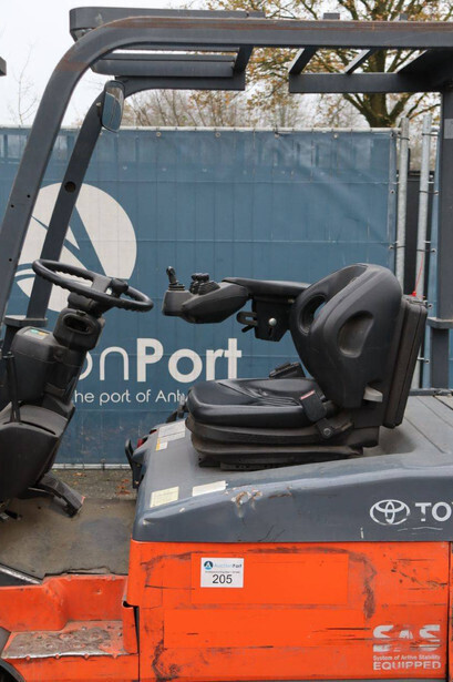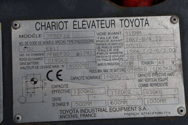 Brand: Toyota Type: 7FBEF16 Serial number: 7FBEF20 017412 Year of construction: 2008 Fuel: Electric Mast type: Triplex Sideshift: Yes Lifting capacity: 1600 kg Lifting height: 6000 mm Reading operating hours: 13018 h Machine weight: 3255 kg Tires: Solid tires Color: orange