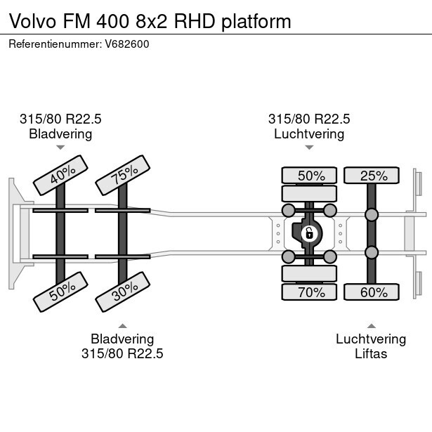 Platform dimensions 820x255 cm, VBG trailer hitch, twist locks // Truck 8x2, Euro 5, AdBlue, Diff. lock, Automatic gearbox, Steel suspension front, Air suspension rear, 4th axle lift axle, Day cabin, Airconditioning, Digital tachograph, RIGHT-HAND DRIVE , Shipment dimensions 1180x255x370 cm.
