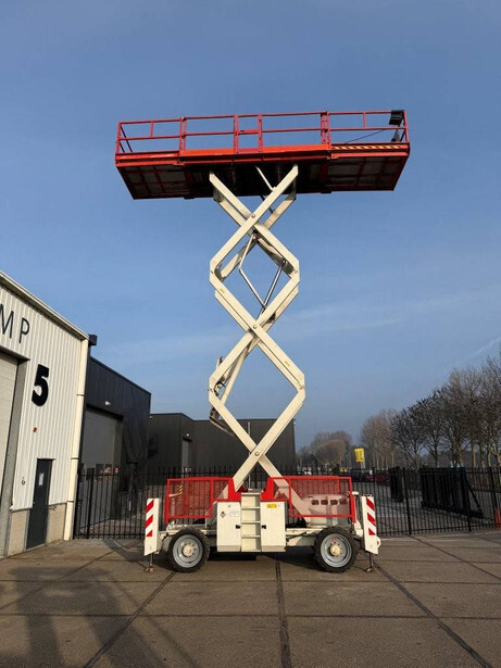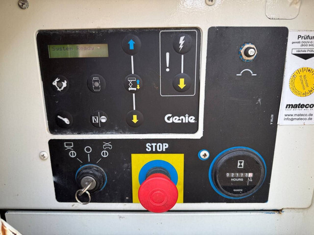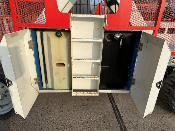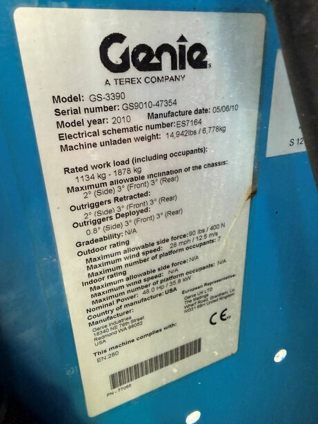 Brand: Genie Type: GS-3390 Serial number: GS9010-47354 Year of construction: 2010 Fuel: Diesel Lifting capacity: 1878 kg Working height: 12 m Operating hours read: 2173 h Machine weight: 6778 kg Chassis: Wheels Type: Scissor lift Tires: Pneumatic tires Color: blue