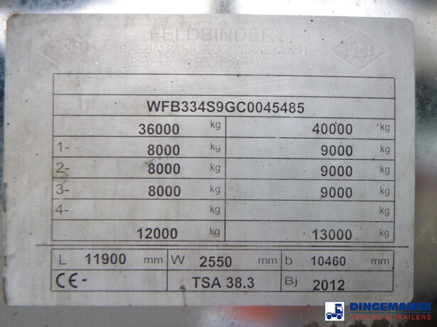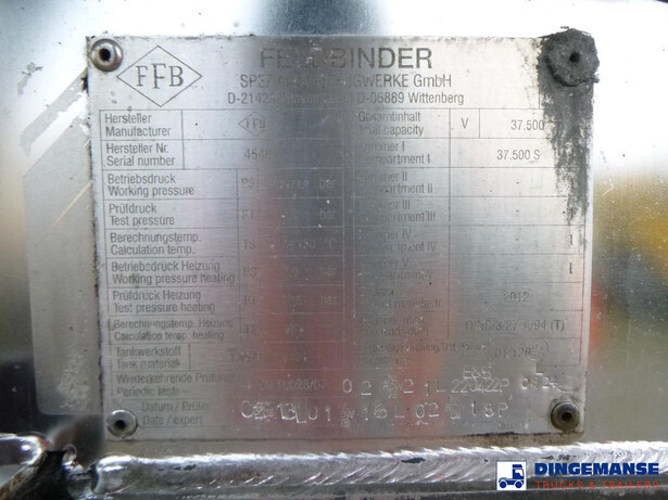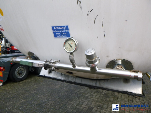 NON-EU VEHICLE, REQUIRES CUSTOMS CLEARANCE // Insulated inox (stainless steel) chemical tank, Capacity 37500 liter, 1 Compartment, Year of construction 2012, Tank material code 1.4571 / 1.4404, Test pressure 4.0 bar, Max working pressure 3.0 bar, Steam heating, Air suspension, BPW Eco Plus axles, Disc brakes ABS, Alloy wheels, Shipment dimensions 1190x250x360 cm
