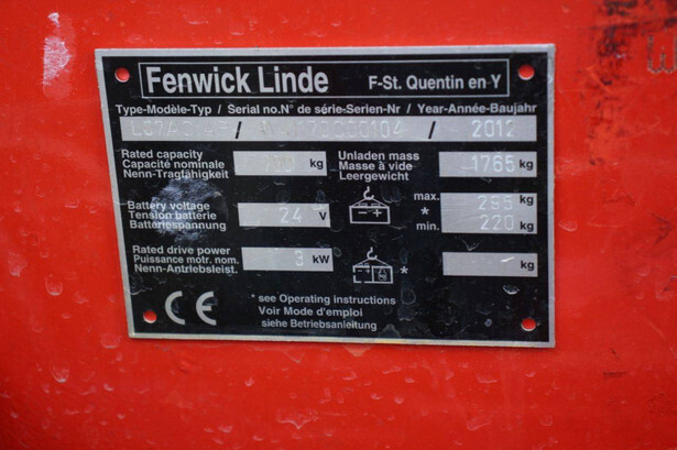Brand: Linde Type: L07ACAP Serial number: W41170000104 Year of construction: 2012 Fuel: Electric Mast type: Duplex Lifting capacity: 700 kg Lifting height: 2460 mm Operating hours read: 1657 h Machine weight: 2060 kg Color: red