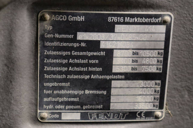 Brand: Fendt Type: 513 VARIO Serial number: 414211034 Year of construction: 2013 Fuel: Diesel Engine power: 110 kW Reading operating hours: 9981 h Machine weight: 10500 kg Tires: Pneumatic tires Color: green