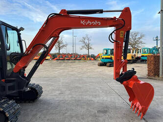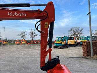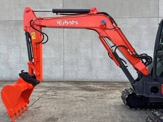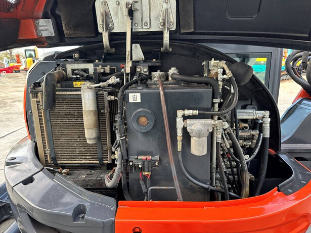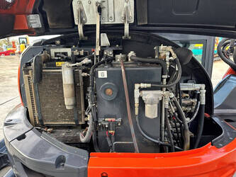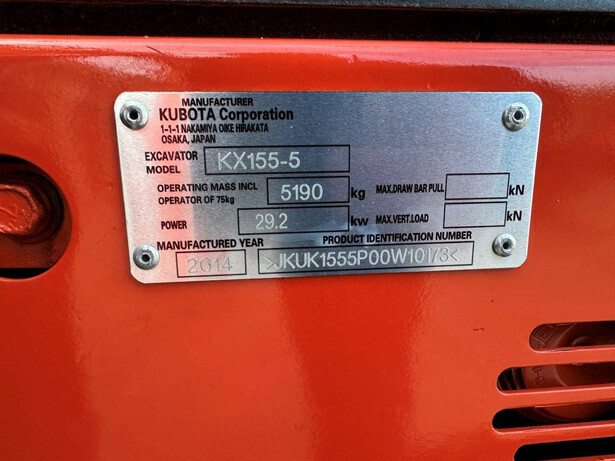 Brand: Kubota Type: KX155-5 Serial number: JKUK1555P00W10173 Year of construction: 2014 Fuel: Diesel Engine power: 40 HP Engine brand: Kubota V2403 Number of cylinders: 4 Quick change: Yes Operating hours read: 4214 h Machine weight: 5190 kg Running gear: Tracks Color: orange Transport dimensions: 5500 x 200 x 2600mm Tray width: 650mm Track width: 400mm