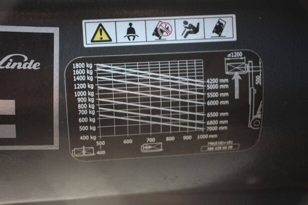 Brand: Linde Type: E18PH-02 Serial number: H2X386E53854 Year of construction: 2014 Fuel: Electric Mast type: Duplex Sideshift: Yes Lifting capacity: 1800 kg Lifting height: 7000 mm Operating hours read: 4482 h Tires: Solid tires Color: red