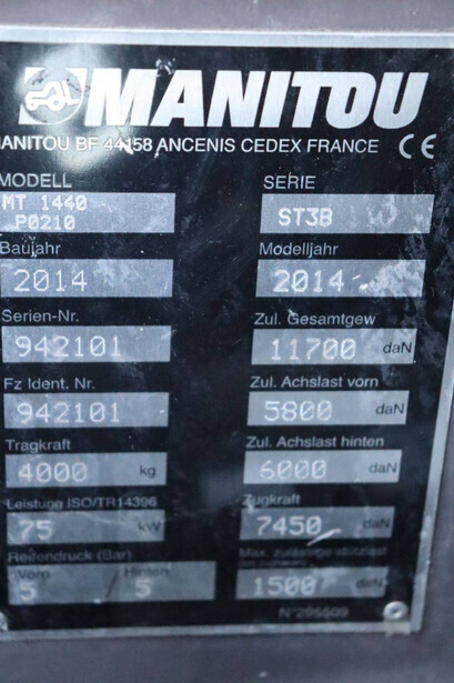 Brand: Manitou Type: MT 1440 Serial number: 942101 Year of construction: 2014 Fuel: Diesel Engine power: 75.0 kW Lifting capacity: 4000 kg Lifting height: 14000 mm Operating hours read: 3965 h Machine weight: 11930 kg Tires: Pneumatic tires Color: red