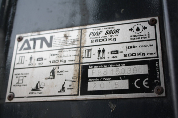 Brand: ATN Type: 880R Serial number: P8815038 Year of construction: 2015 Fuel: Electric Lifting capacity: 200 kg Working height: 8.80 m Operating hours read: Not known Machine weight: 2600 kg Chassis: Wheels Type: Mast lift Tires: Pneumatic tires Color: blue