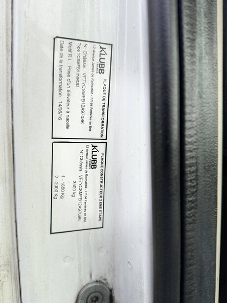 Brand: Citroën Type: Jumper 2.2HDI Serial number: VF7YCSMFB12A97086 Year of construction: 2016 Fuel: Diesel Engine power: Not known Mileage reading: Not known Lifting capacity: 120 kg Working height: Not known Reading operating hours: 1351 h Tires: Pneumatic tires Color: white