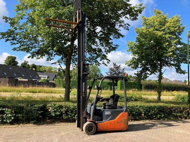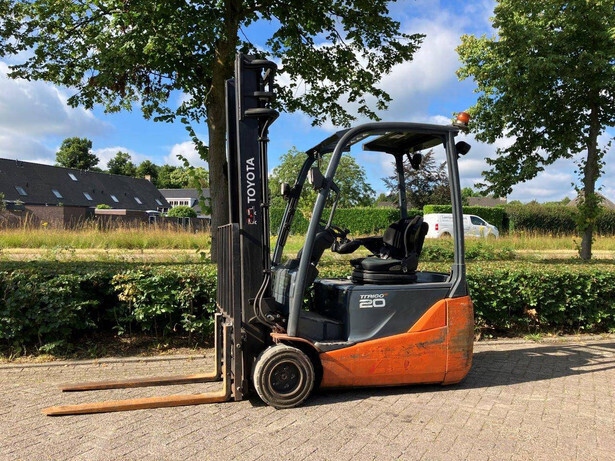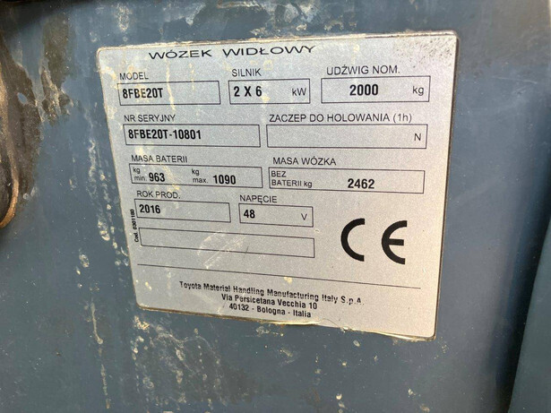 Brand: Toyota Type: 8FBR20T Serial number: 10801 Year of construction: 2016 Fuel: Electric Mast type: Duplomast Sideshift: Yes Lifting capacity: 2000 kg Lifting height: Not known Operating hours read: 26830 h Machine weight: Not known Color: orange
