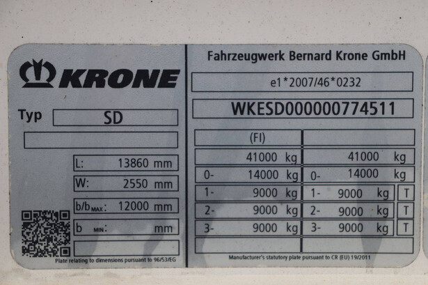 Brand: Krone Type: SD Chassis number: WKESD000000774511 Year of construction: Not known MTM: 41000 kg Number of axles: 3 Brakes: Disc brakes Odometer reading: 275683 KM