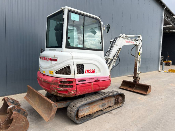 The Takeuchi TB230 is a robust mini excavator designed for superior performance on the job site. Powered by a Yanmar 3TNV88F-EPTB engine delivering 18.2 kW, it complies with EPA and CE standards. The machine features a mono boom with a stick measuring 1.45m in length and a mechanic quick release system for efficient attachment changes. It includes a ditch cleaning bucket with a width of 1.25m and an additional digging bucket with teeth, available in widths of 0.60m and 0.30m. Equipped with piping for a hammer and an AM/FM radio, this excavator ensures excellent operational efficiency and operator comfort. The TB230 is in good and clean condition, reflecting its diligent maintenance since its manufacture in 2017. With a size of 4.30 x 1.46 x 2.50m and a weight of 2875 kg, this Japan-made mini excavator promises reliability and productivity.