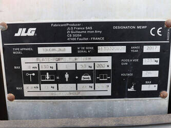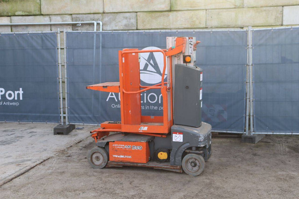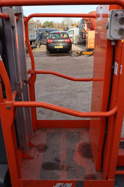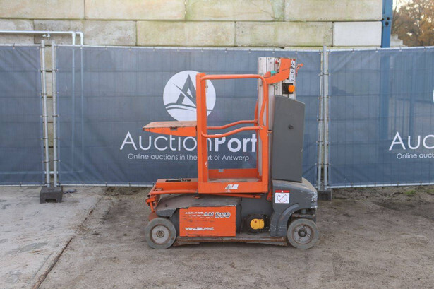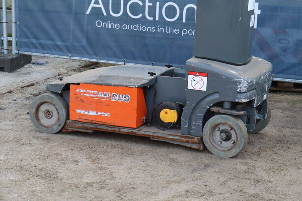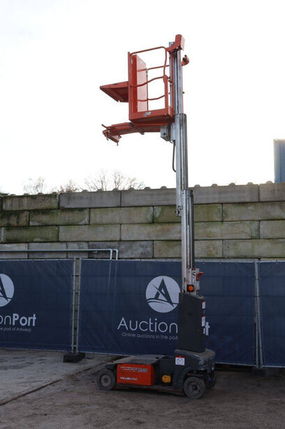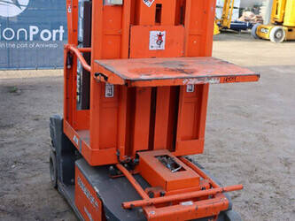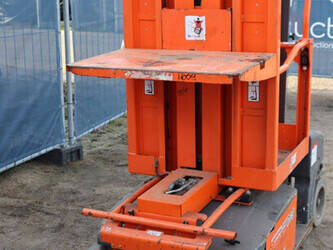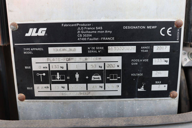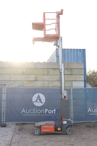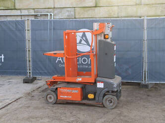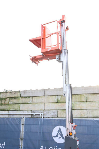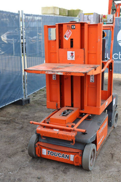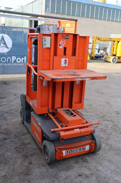 Brand: Toucan Type: TOUCAN DUO Serial number: A130020828 Year of construction: 2017 Fuel: Electric Lifting capacity: 130 kg Working height: 6 m Operating hours read: Not known Machine weight: 1030 kg Chassis: Wheels Type: Mast lift Tires: Non-marking tires Color: orange