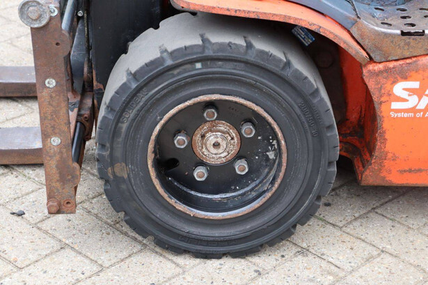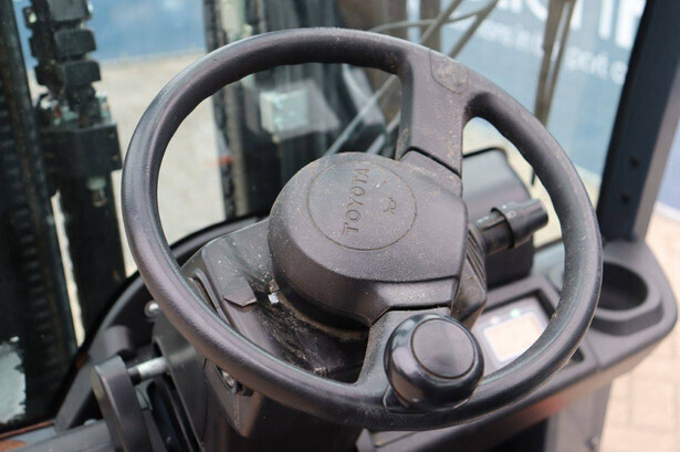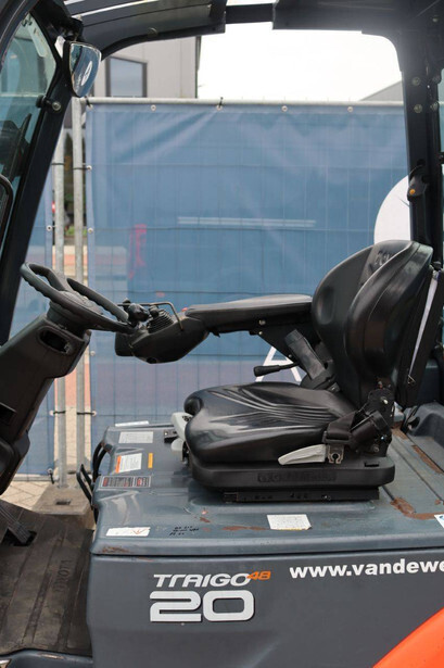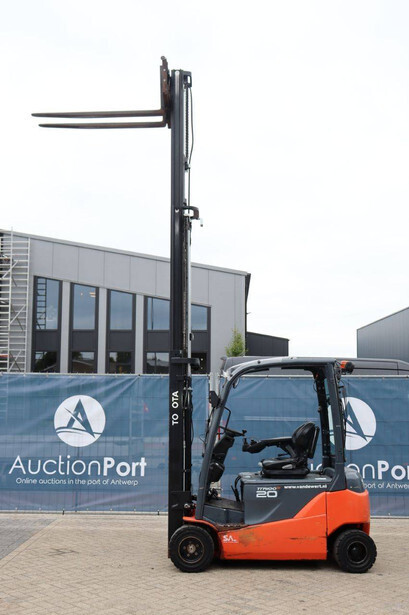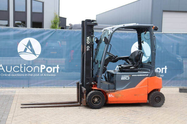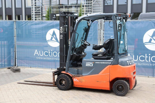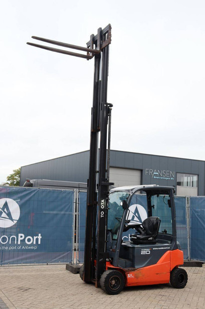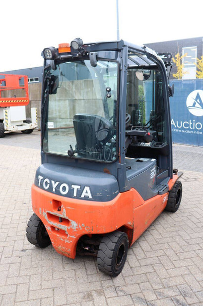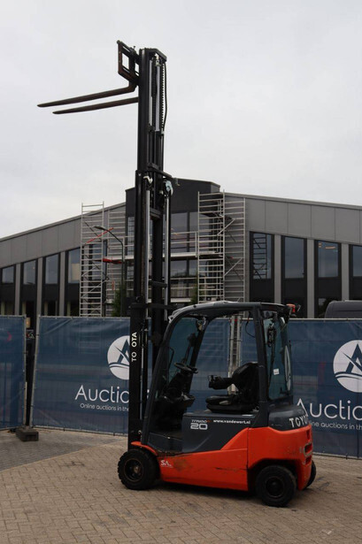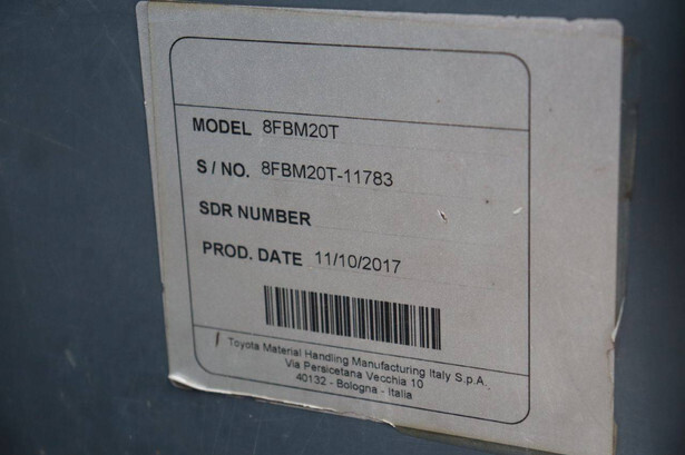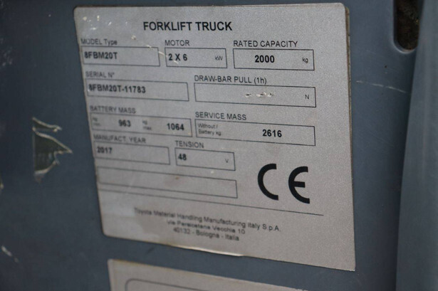 Brand: Toyota Type: 8FBM20T Serial number: 8FBM20T-11783 Year of construction: 2017 Fuel: Electric Mast type: Triplex Sideshift: No Lifting capacity: 2000 kg Operating hours read: 6141 h Machine weight: 3680 kg Tires: Solid tires Color: orange
