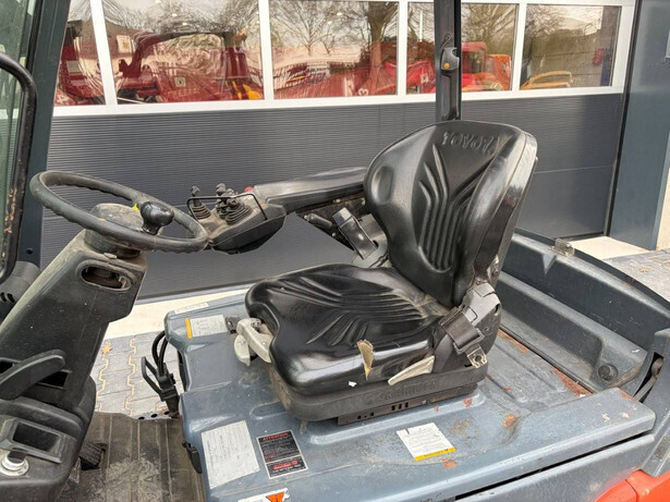 Brand: Toyota Type: 8FBM20T Serial number: 8FBM20T-11776 Year of construction: 2017 Fuel: Electric Mast type: Triplex Sideshift: Yes Lifting capacity: 2000 kg Lifting height: Not known Operating hours read: 6001 h Machine weight: 3550 kg Tires: Solid tires Color: orange