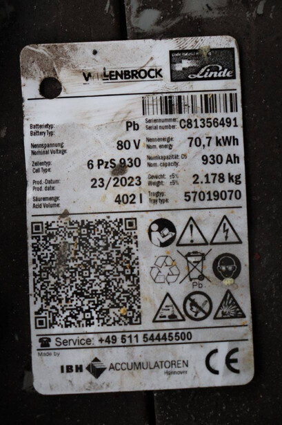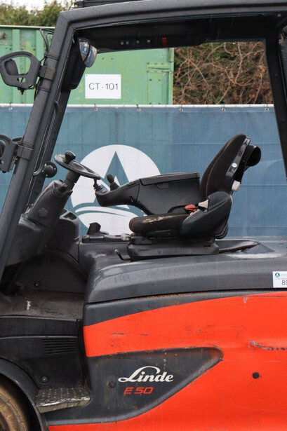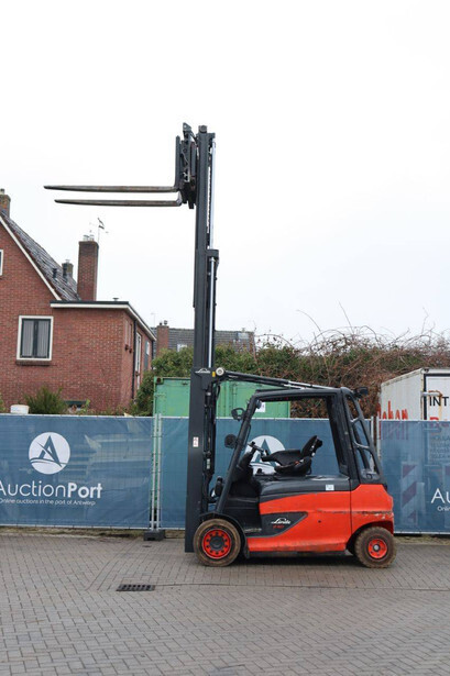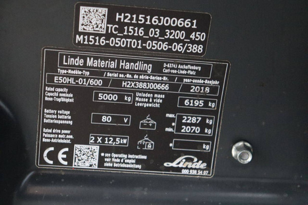 Brand: Linde Type: E50HL-01/600 Serial number: H2X388J00666 Year of construction: 2018 Fuel: Electric Mast type: Triplex Sideshift: Yes Lifting capacity: 5000 kg Lifting height: 6500 mm Operating hours read: 20019 h Machine weight: 8482 kg Tires: Solid tires Color: orange