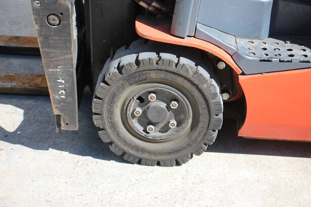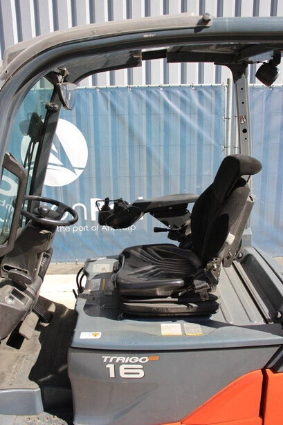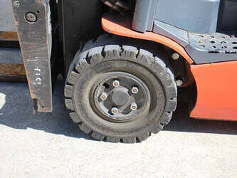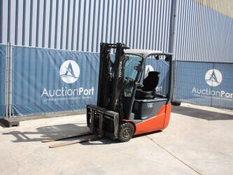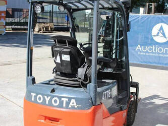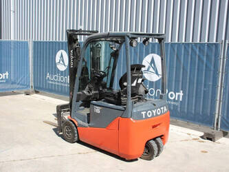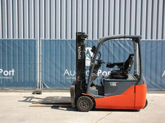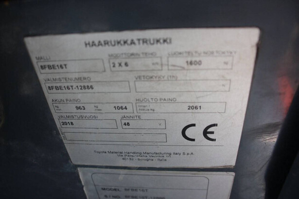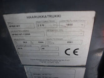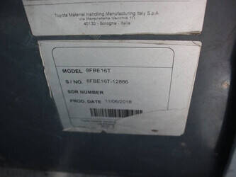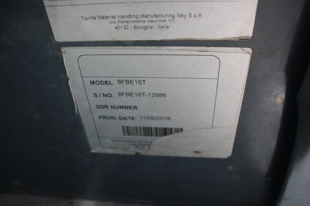 Brand: Toyota Type: 8FBE16T Serial number: 8FBE16T-12886 Year of construction: 2018 Fuel: Electric Mast type: Duplex Sideshift: Yes Lifting capacity: 1600 kg Lifting height: 3300 mm Operating hours read: 15323 h Machine weight: 3125 kg Tires: Solid tires Color: orange