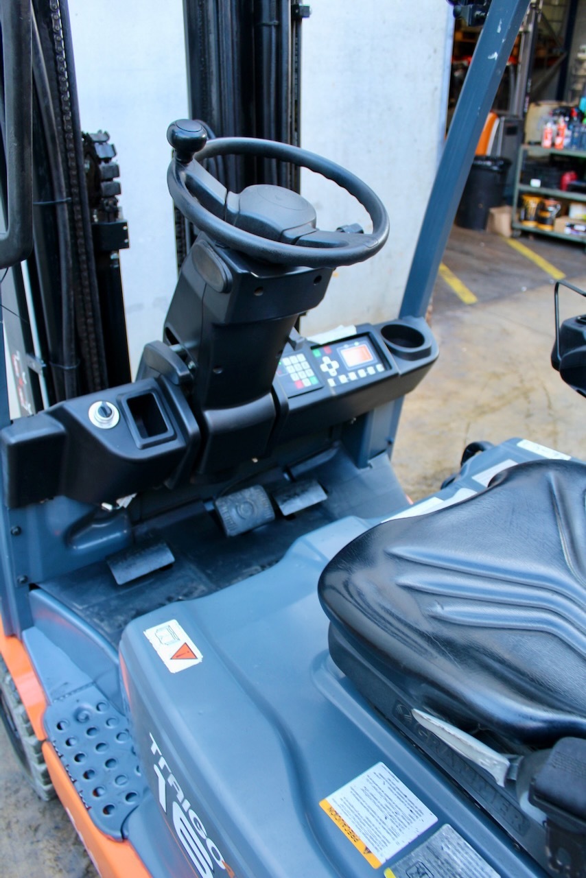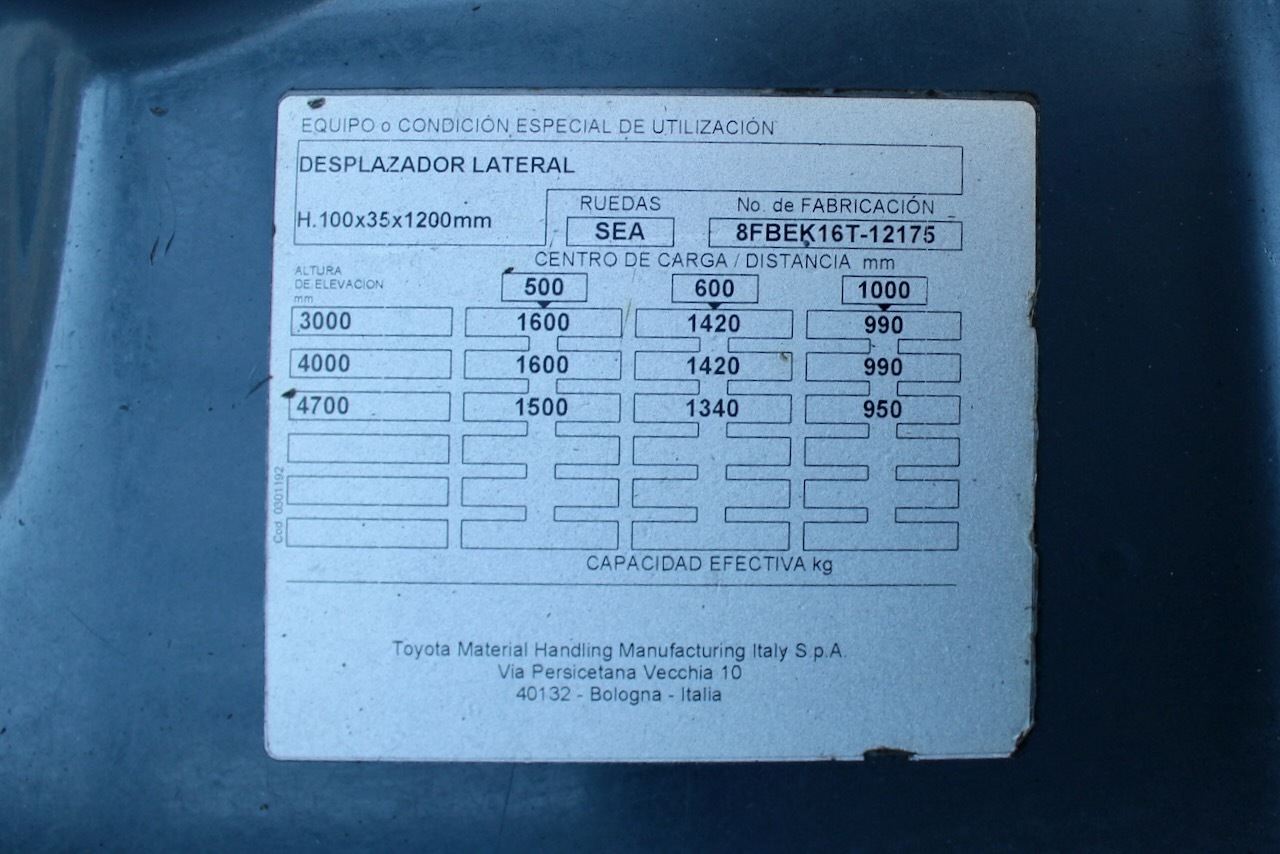 Toyota 8FBEK16T Load capacity: 1.600 Kg Lifting height: 4.700 mm Mast: Triplex Fork: 1.100 mm Build height: 2.150 mm Motorization: Electric Battery: 48v/625Ah Charger: 48 v Good condition, Battery condition 90%, 4 valve, Twin pedal control, Non marking wheels. Reference number: 7605