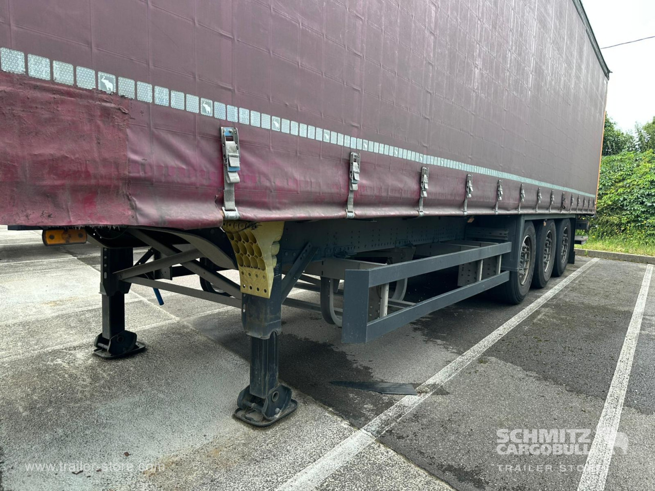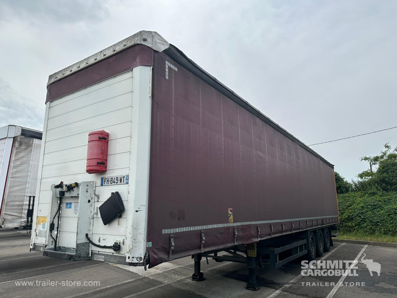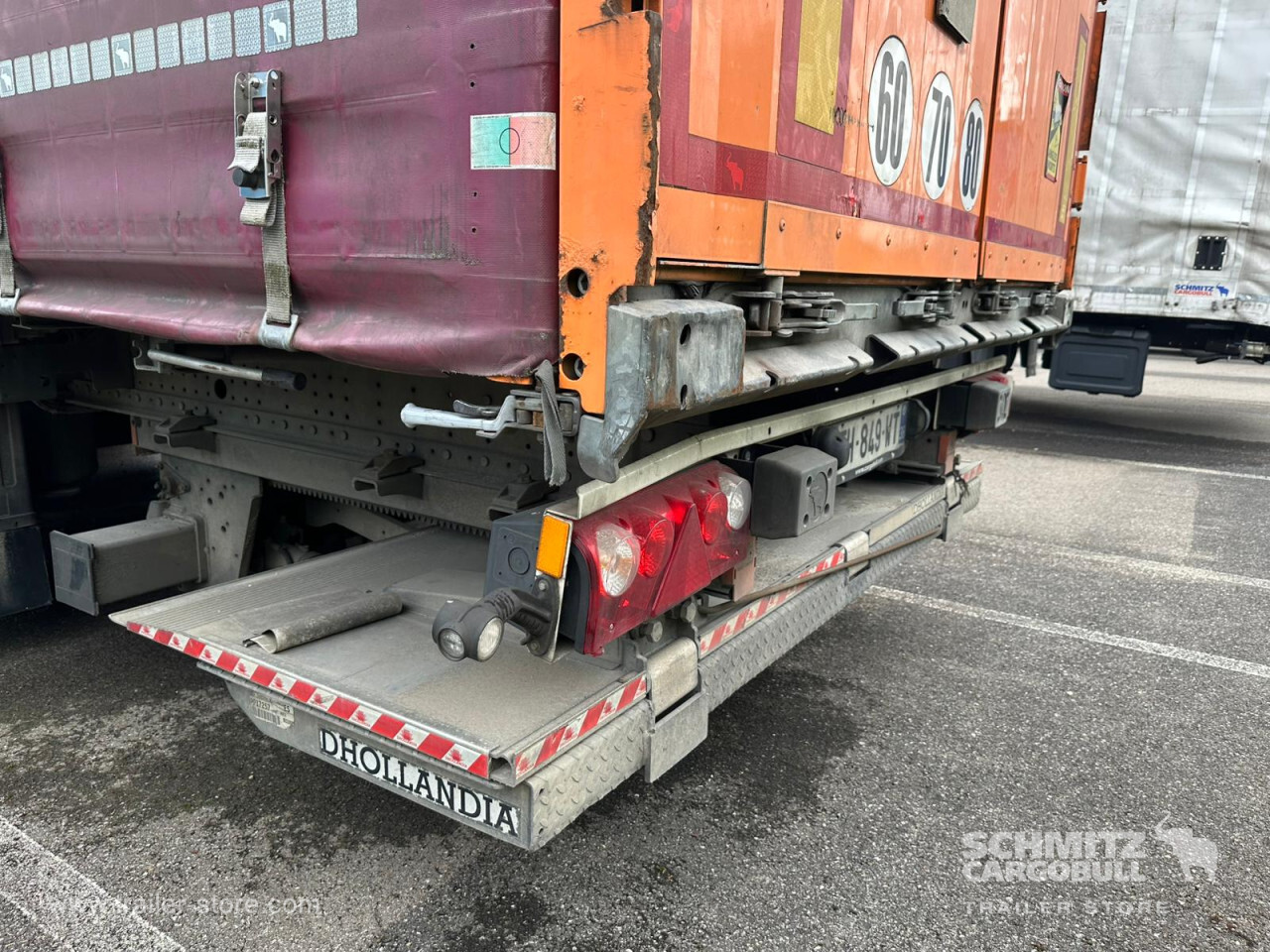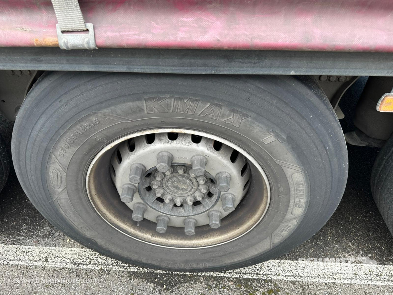 Remarks: **Safety**\\Rear underrun, Antilock Braking System ABS, Fire extinguisher holder\\\\**Exterior**\\Air suspension, Taillift: Dhollandia, Toolbox, Spare wheel carrier double, Bolted chassis, Sliding roof, 1x15 and 2x7 pin plug, Antispray\\\\**Cargo securing**\\DIN EN 12642 (code XL) certificate, Punched load securing side rave, Wooden - support slats\\\\**Brake system**\\Disc brake, Schmitz ROTOS\\\\**Floor**\\Wooden floor\\\\**Loading area**\\Length 13.620 mm, Width 2.480 mm, Height 2.780 mm, Volume 93 m³\\\\**Tyre sizes**\\1. Achse: 385/65 R22.5 , Tread depth: 2 mm / 2 mm, 2. Achse: 385/65 R22.5 , Tread depth: 6 mm / 6 mm, 3. Achse: 385/65 R22.5 , Tread depth: 4 mm / 2 mm\\\\**Other dimensions and weights**\\Payload: 30.746 kg, GVW: 38.000 kg\\\\----Disques de frein Essieu 1 reste 40,8mm Plaquettes usure 70% Disques de frein Essieu 2 reste 40,8mm Plaquettes usure 70% Disques de frein Essieu 3 reste 41,1mm Plaquettes usure 90% Mines : 10/2025