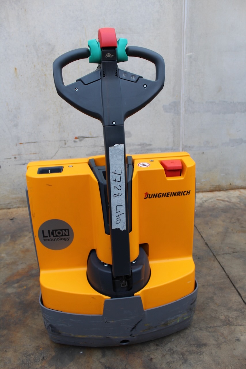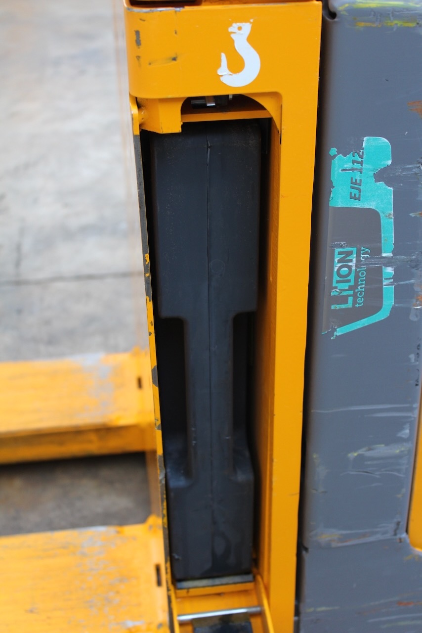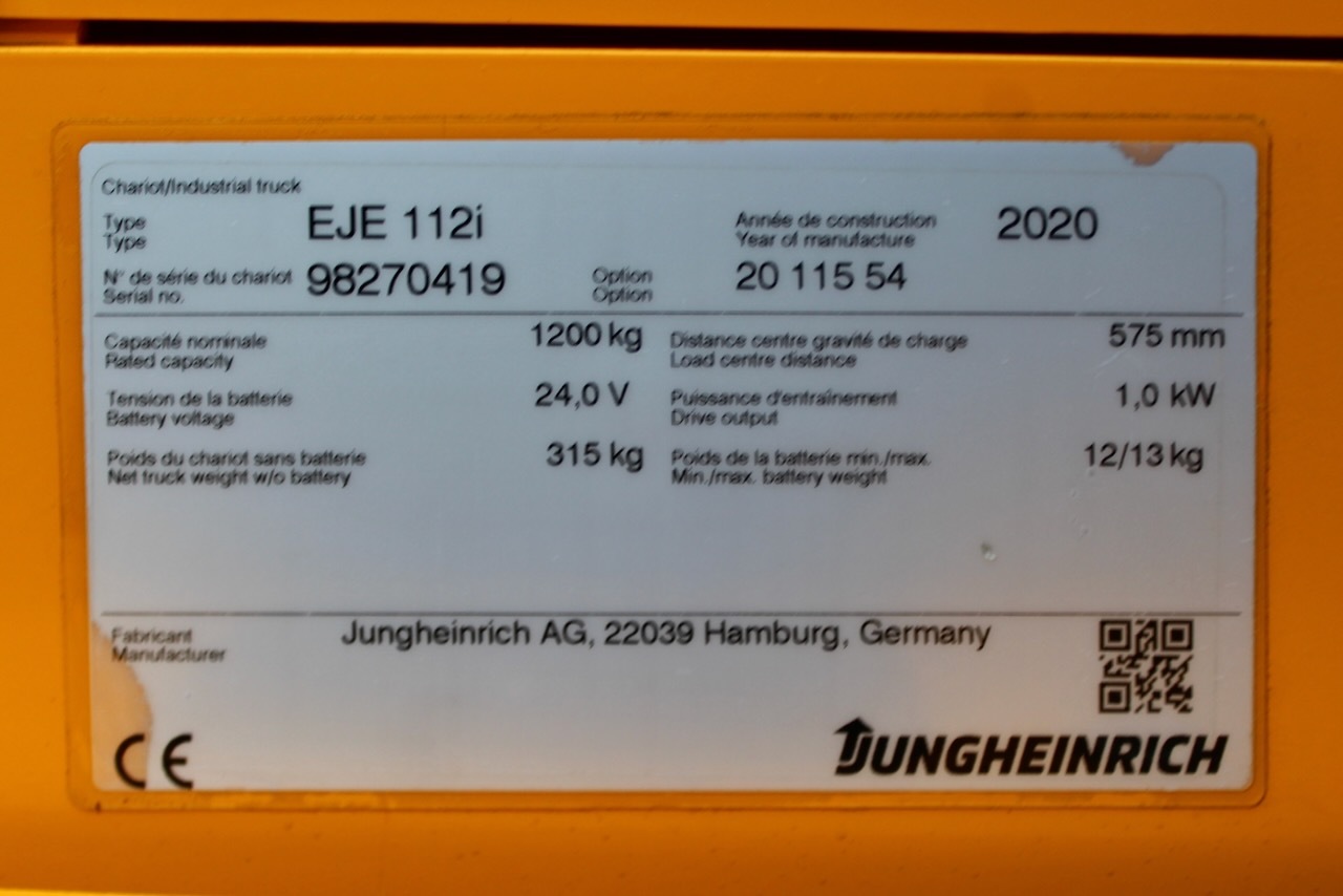 Jungheinrich EJE 112i LI-ION Load capacity: 1.200 Kg Lifting height: Mast: Fork: 1.150 x 540 mm Build height: Motorization: Electric Battery: 24v/40Ah Charger: 24 v incorporated Good condition, ONLY 409 working hours! Lithium battery year 2023.