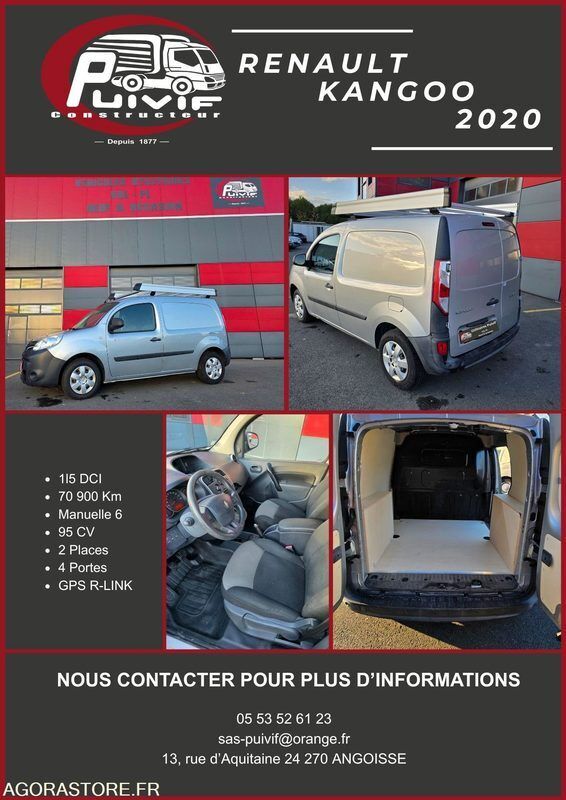 Renault KANGOO Power: 95 Engine volume: 1461 Fuel: gas Axle 1 common tyre size: 195/65 R15 95H Gearbox type: manual Overall height: 1.81 Overall length: 4.28 Overall width: 1.83 FR: Type de véhicule FOURGONNETTE Date et lieu de visite: Du 16 au 30 janvier de 8h à 18h à Angoisse 24270 IMPORTANT: Le contrôle technique sera fait pour la vente Nb portes: 4 Etat carrosserie: Bon Etat intérieur: Bon Etat des pneus: Bons Aménagements intérieurs et rangements: Bois Transmission: AVANT Version: 1.5 DCI Etat soubassements: Bons Ref No:XY49045 VIN: VF1WF000064942090